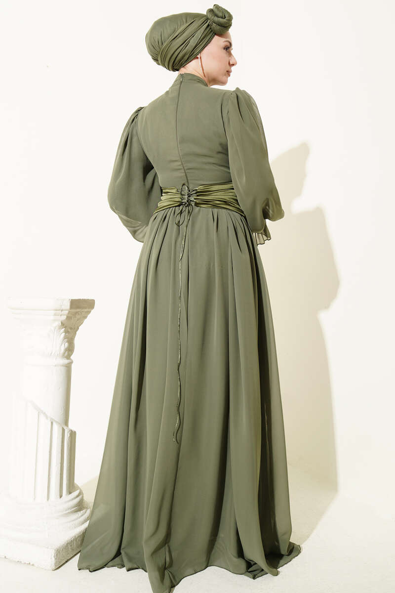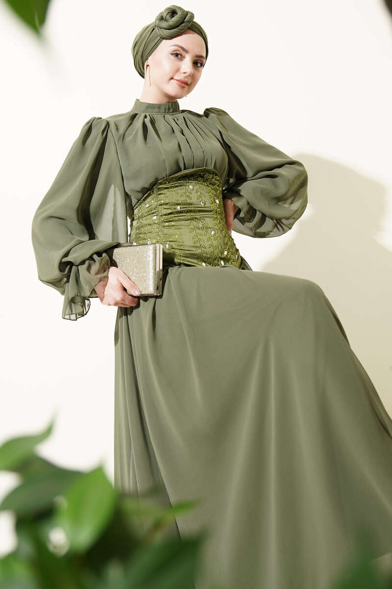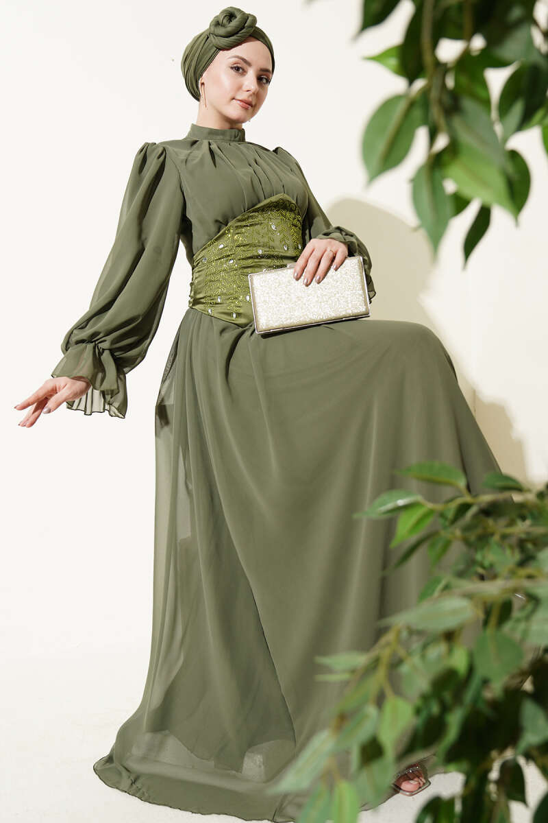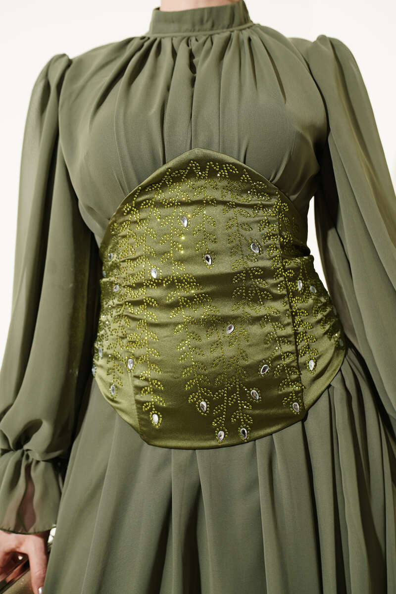 Taş Detaylı Korseli Abiye Elbise Haki