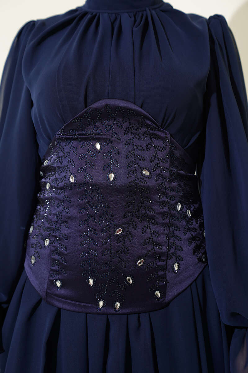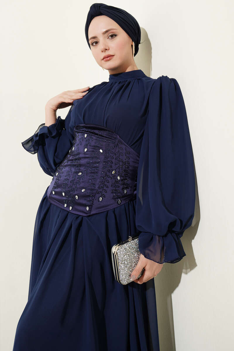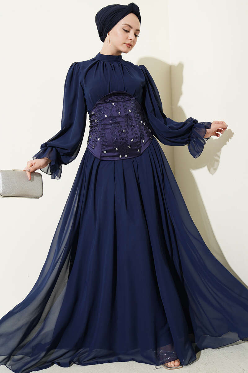 Yaka Büzgülü Fırfırlı Abiye Elbise Lacivert
