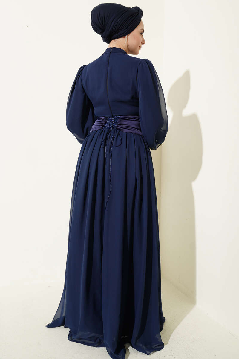 Ayna Kemerli Balon Kol Abiye Elbise Bebe Mavi