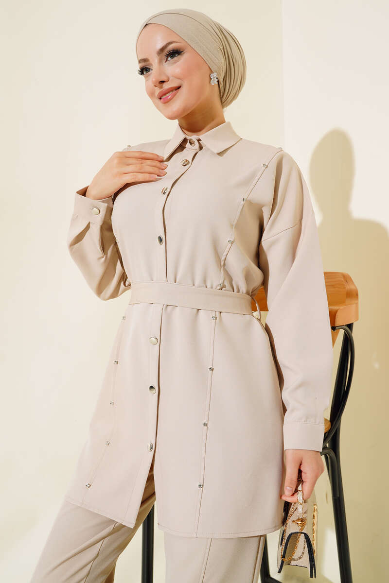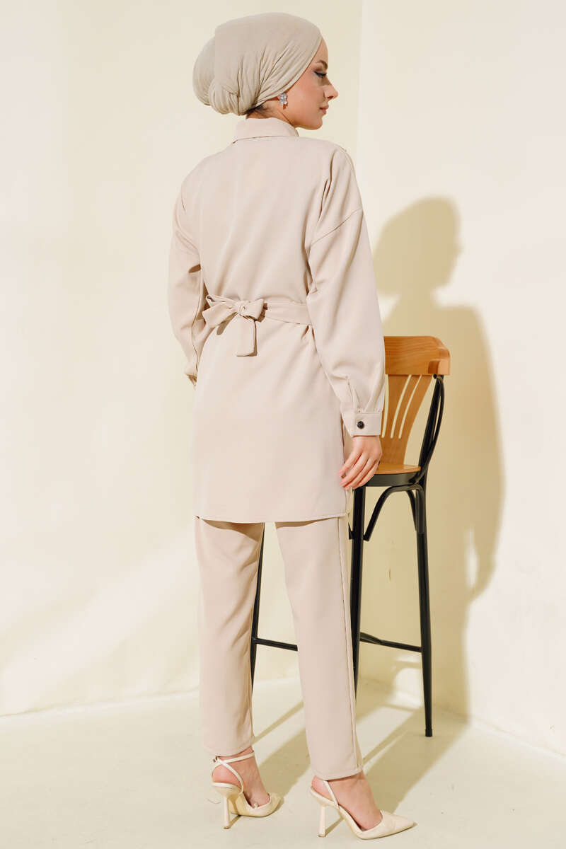 Taş Detaylı Kuşaklı İkili Takım Bej