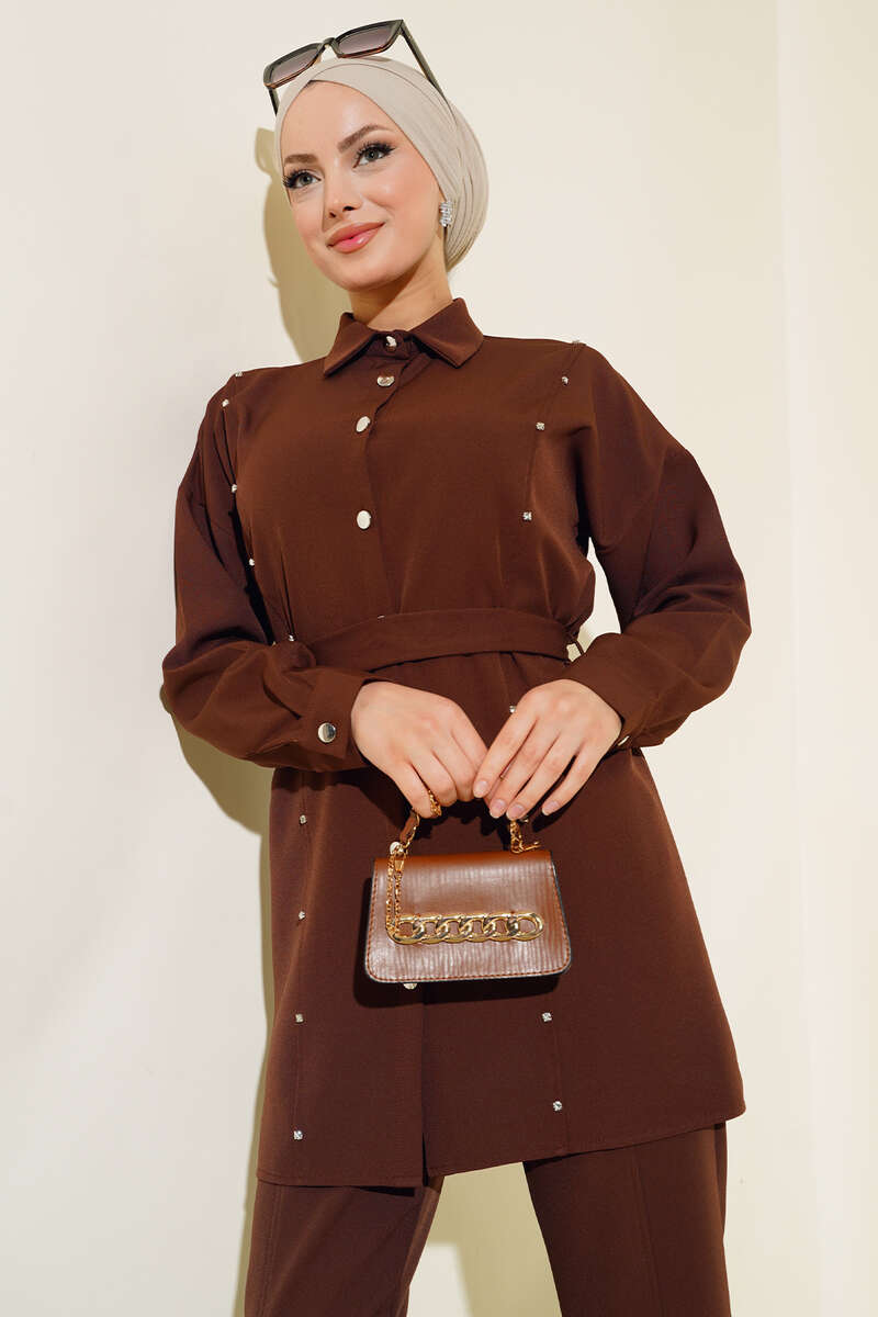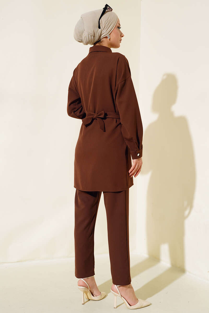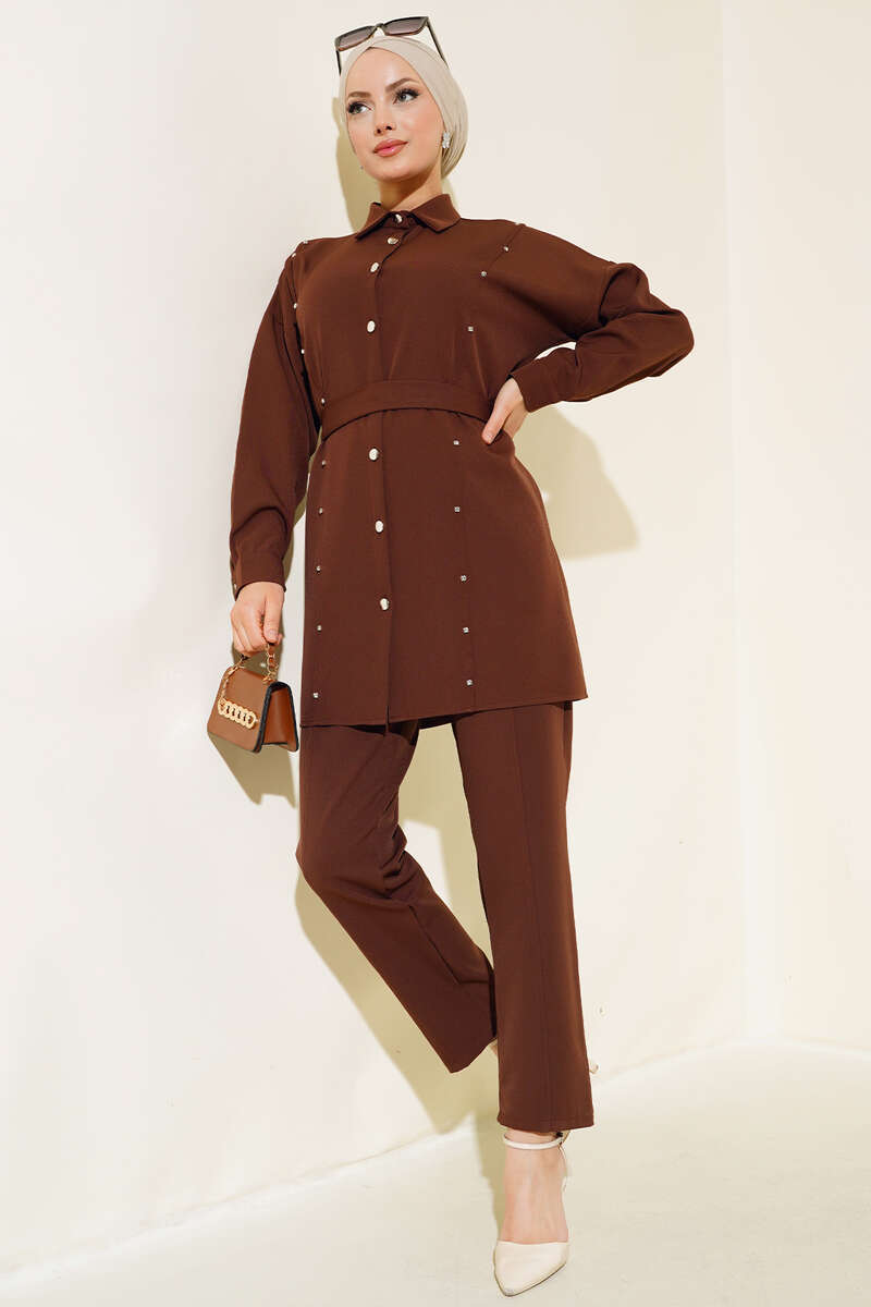 Taş Detaylı Kuşaklı İkili Takım Kahve