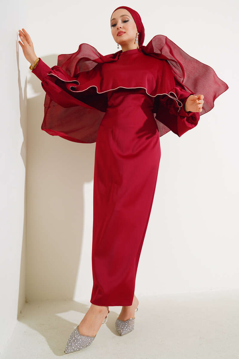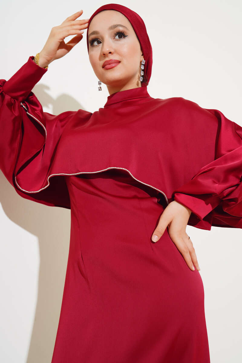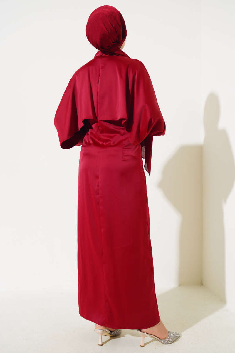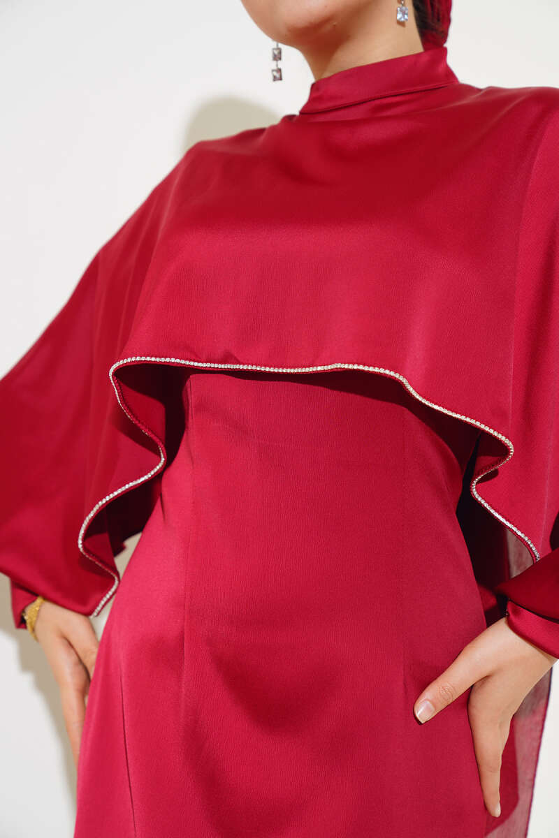 Önü Taşlı Kuşaklı Saten Abiye Elbise Bordo