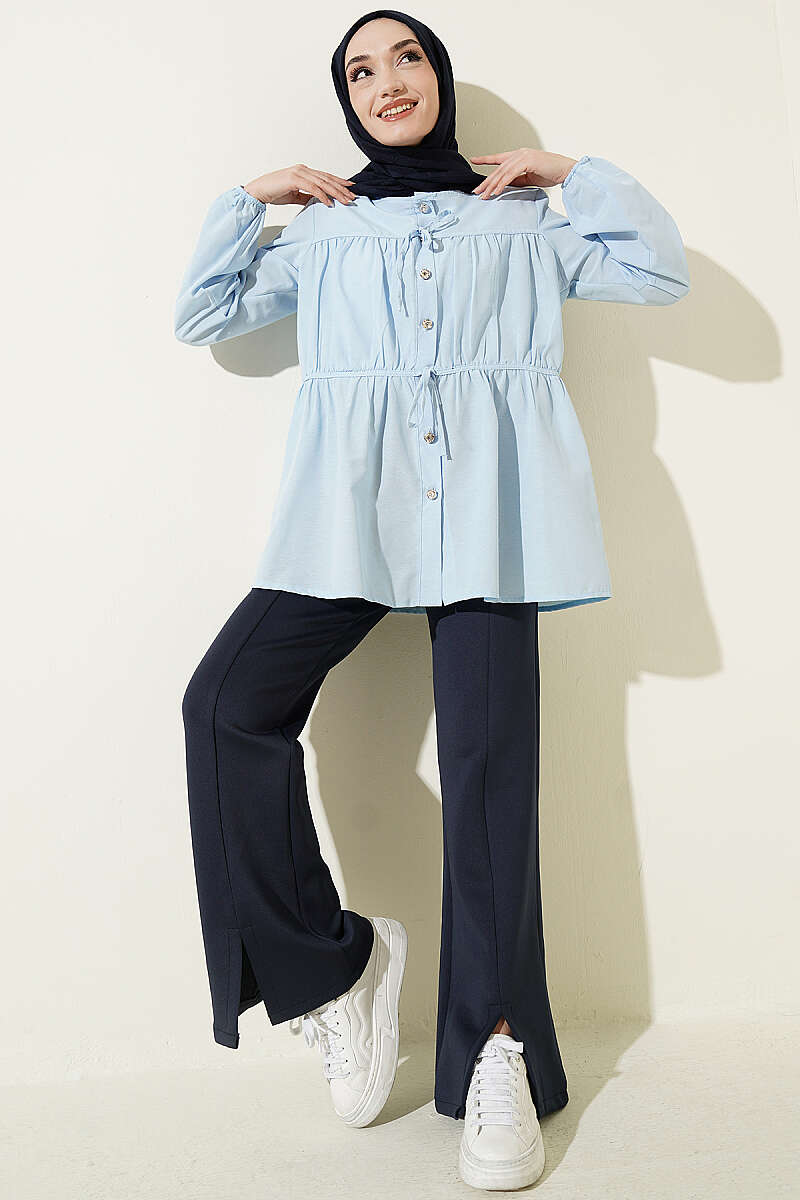 Taş Düğmeli Büzgülü Gömlek Lacivert