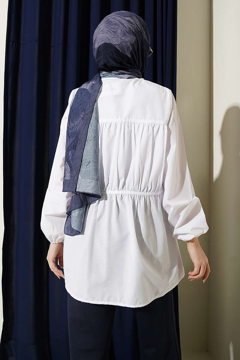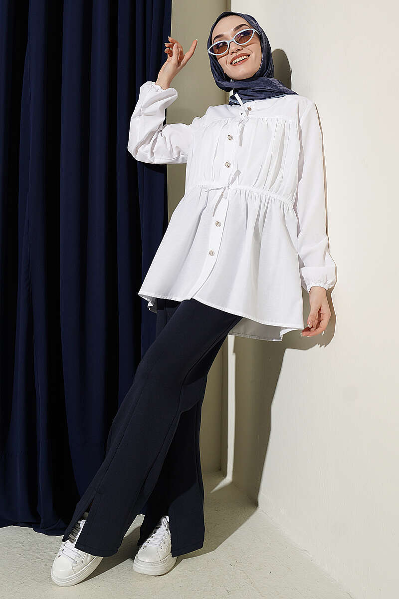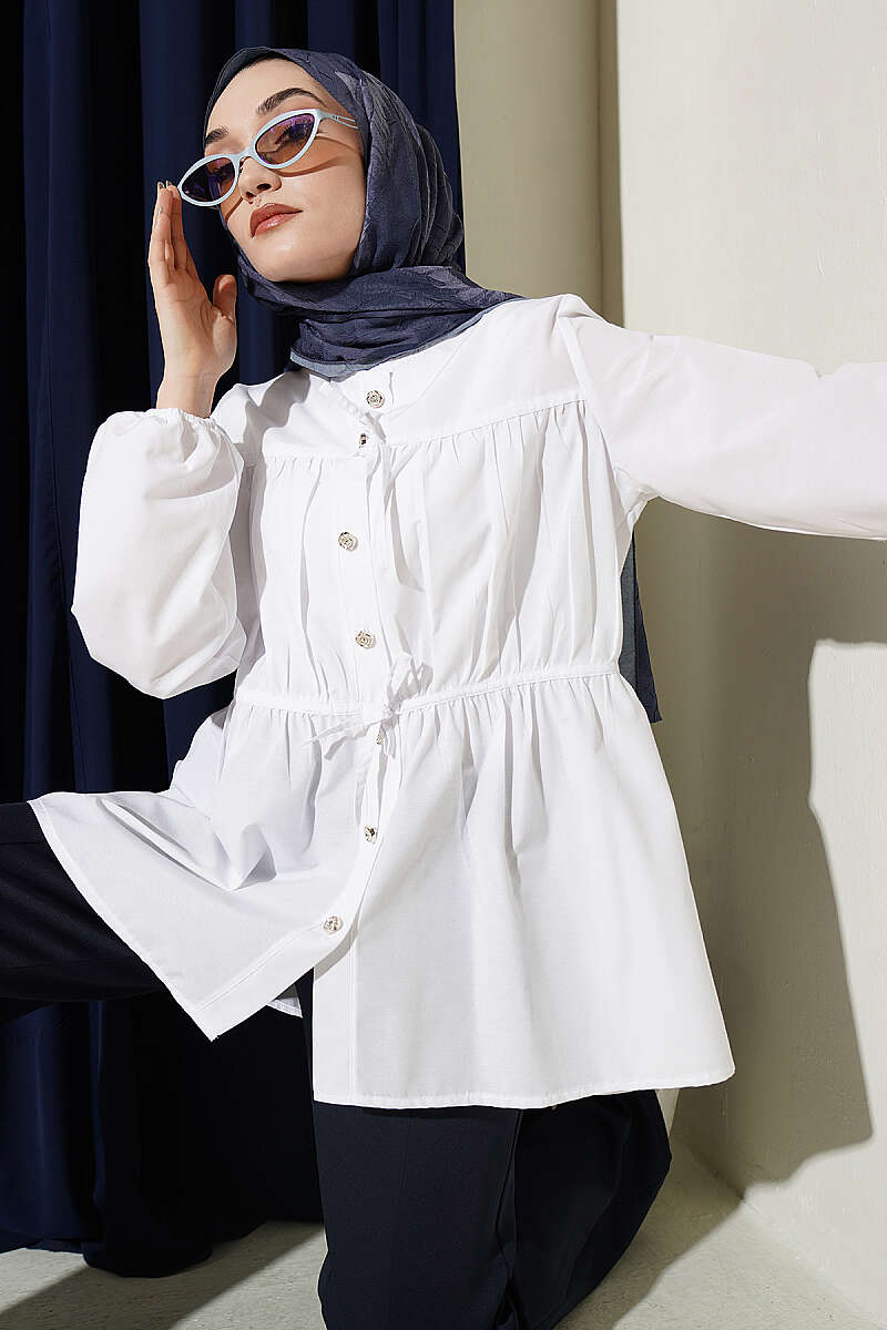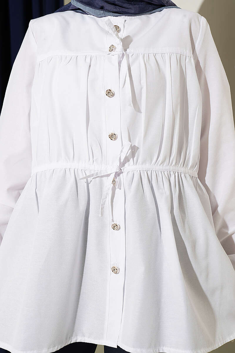Taş Düğmeli Büzgülü Gömlek Beyaz