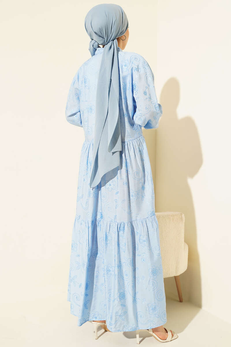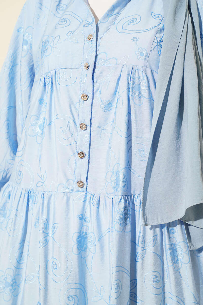 Taş Düğmeli Çiçek Desenli Elbise Bebe Mavi