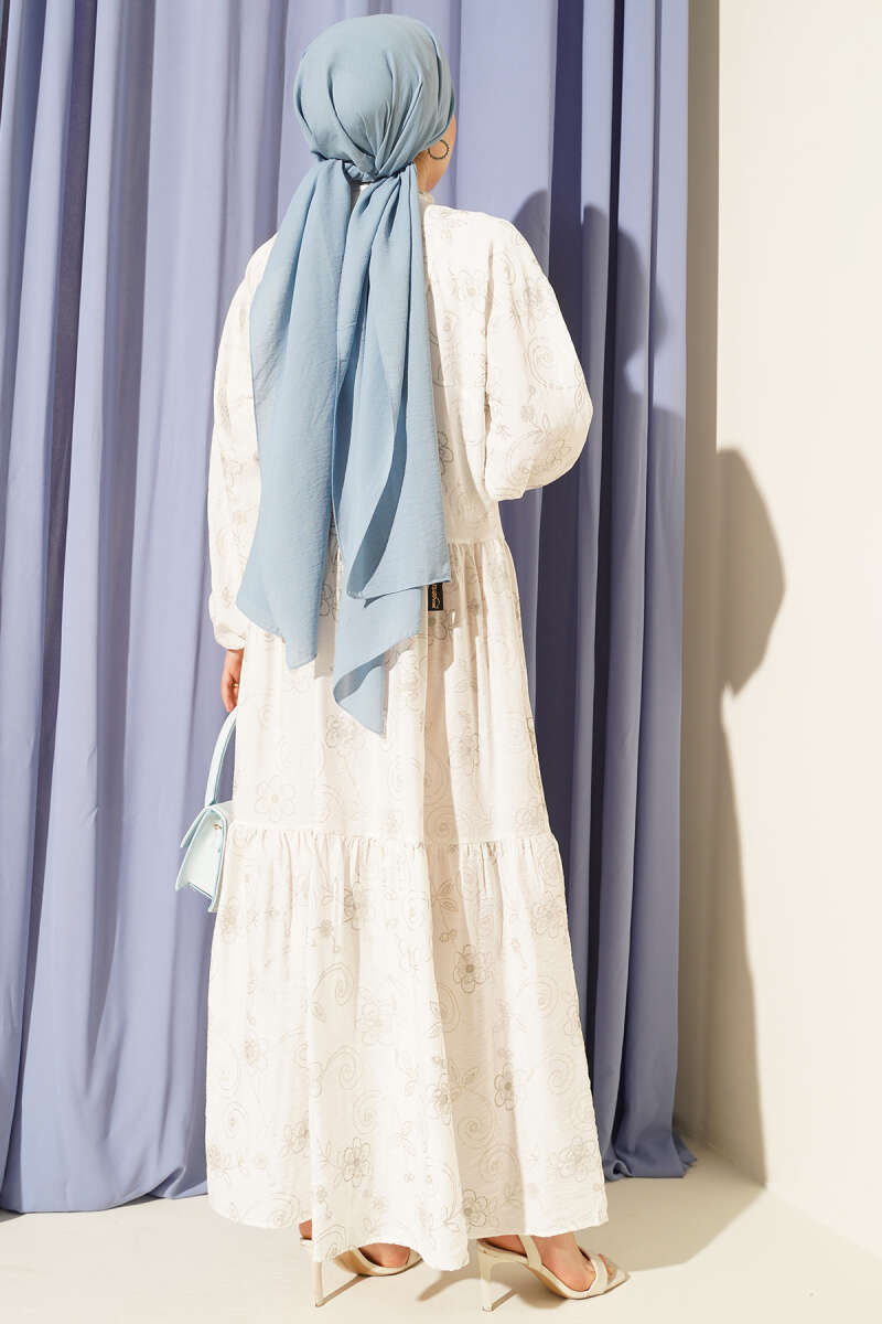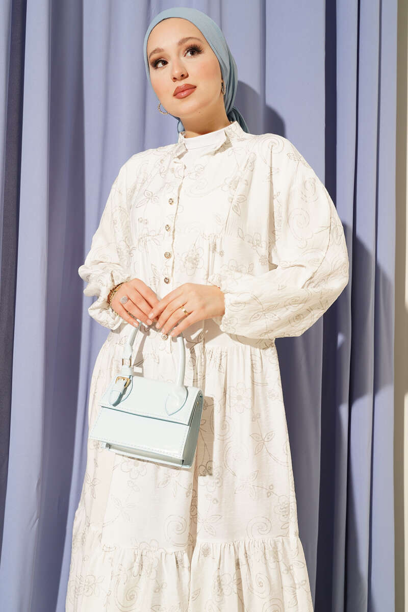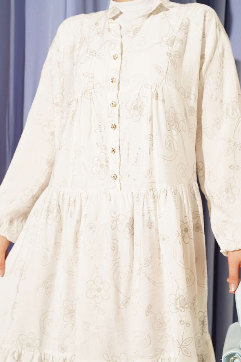 Taş Düğmeli Çiçek Desenli Elbise Ekru
