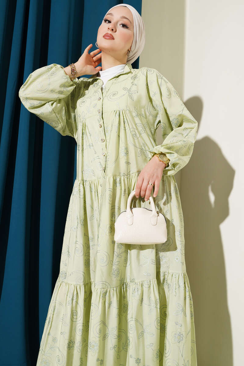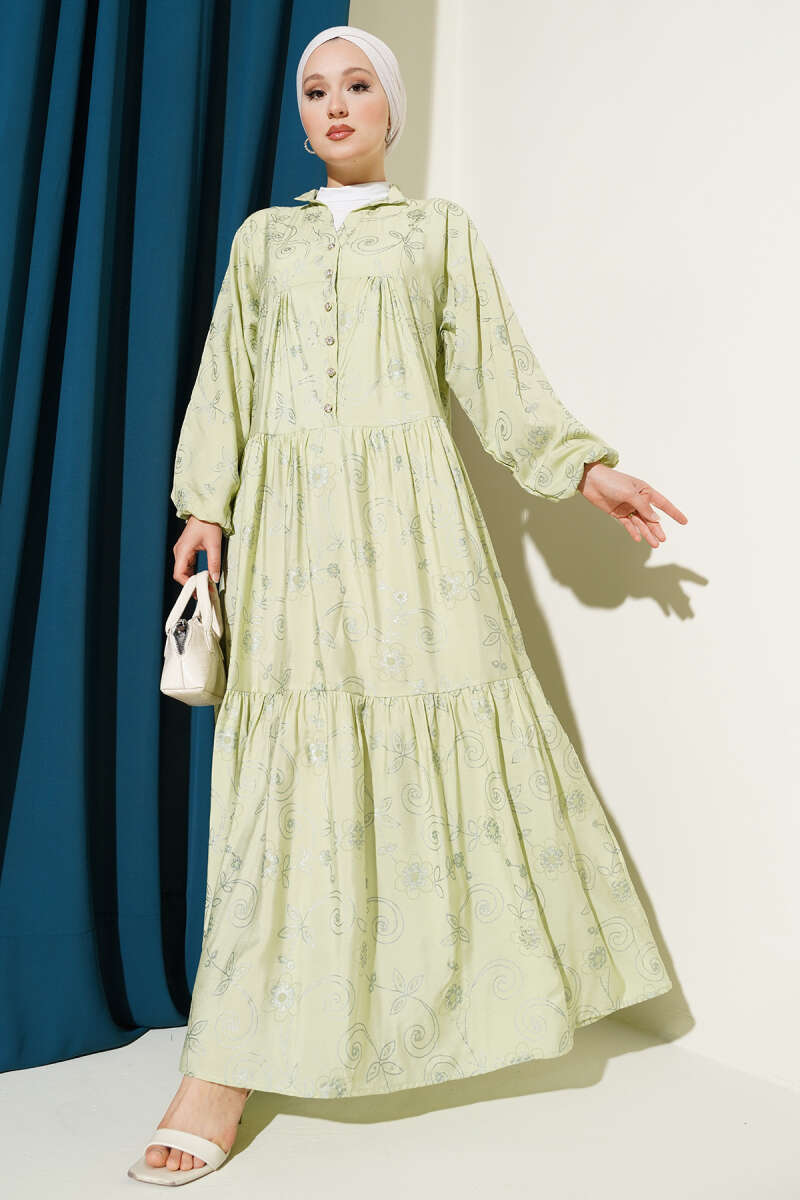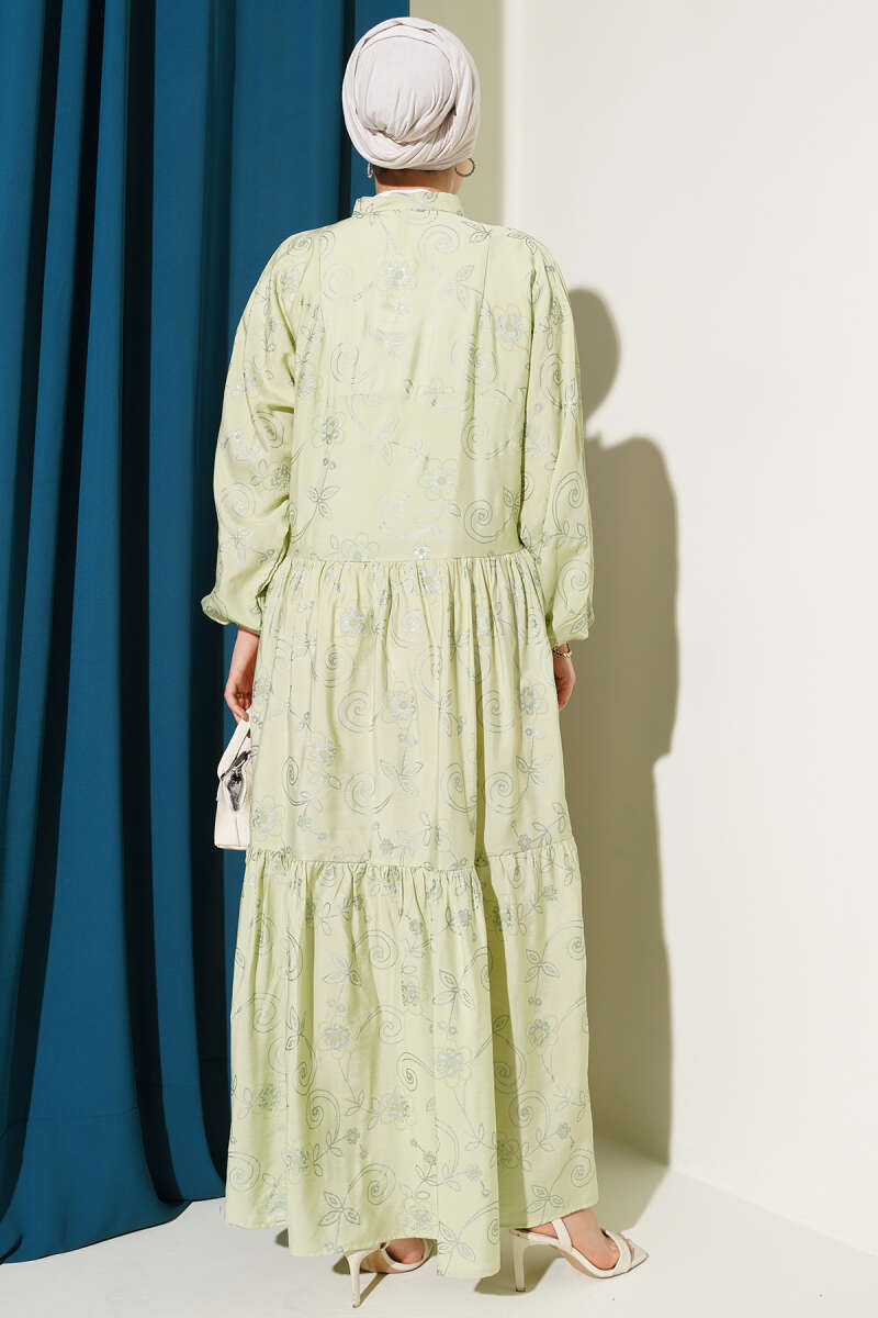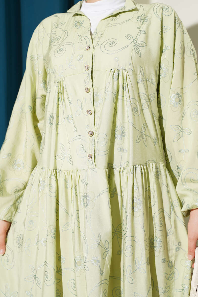 Taş Düğmeli Çiçek Desenli Elbise Su Yeşili