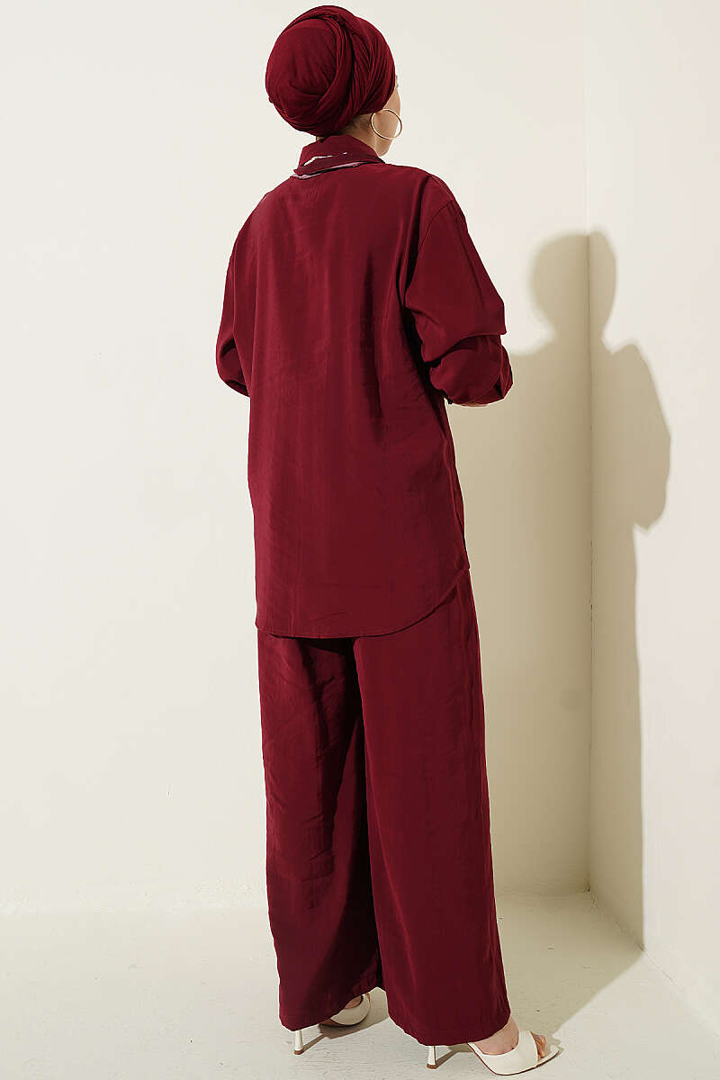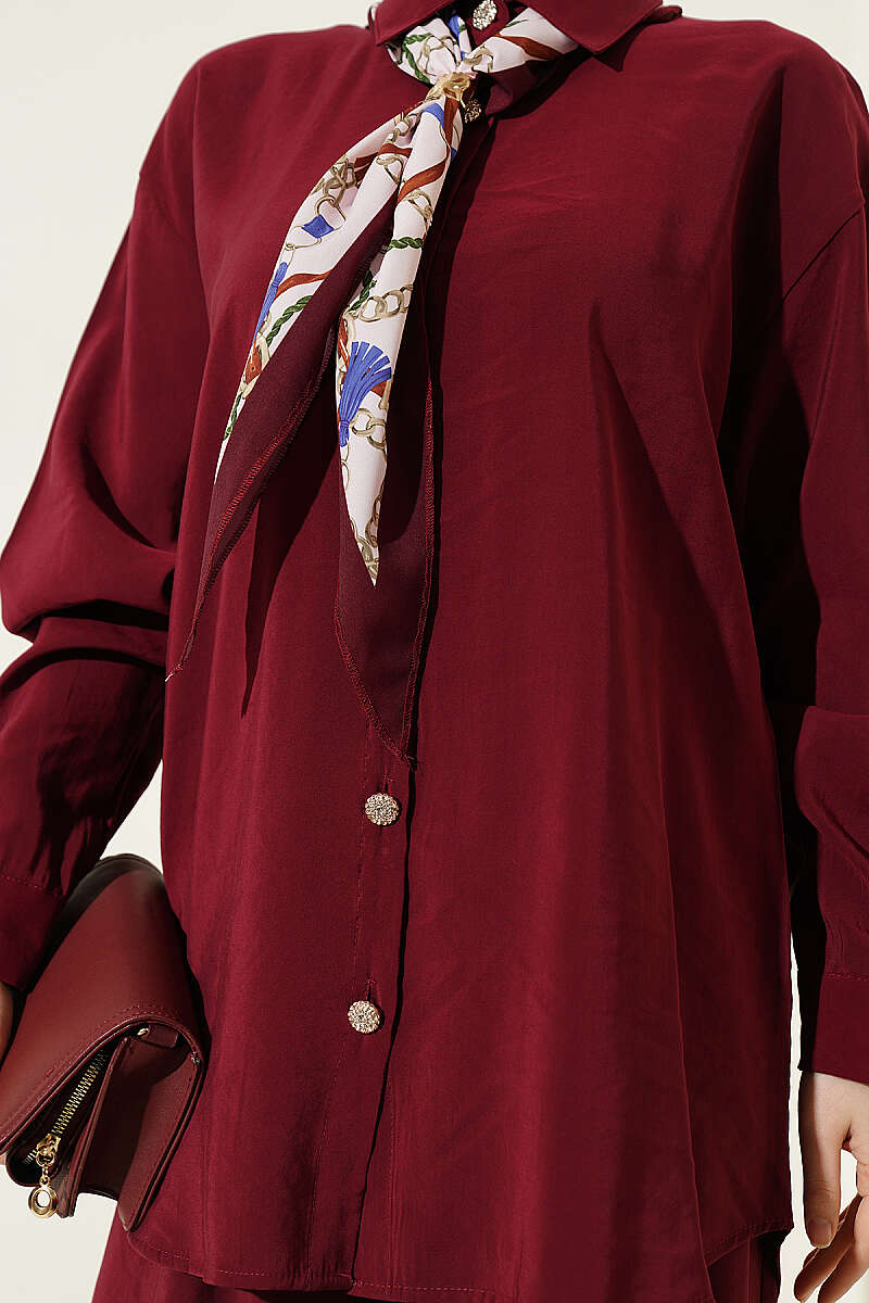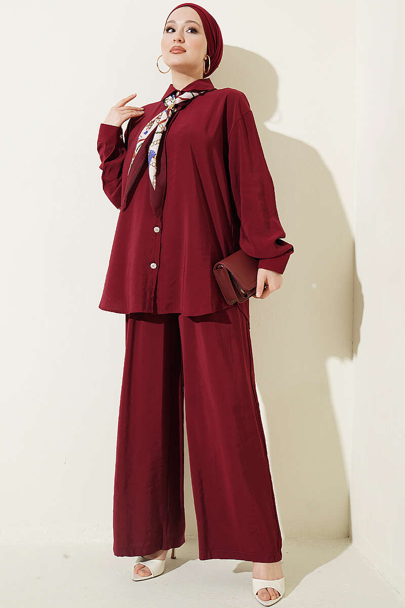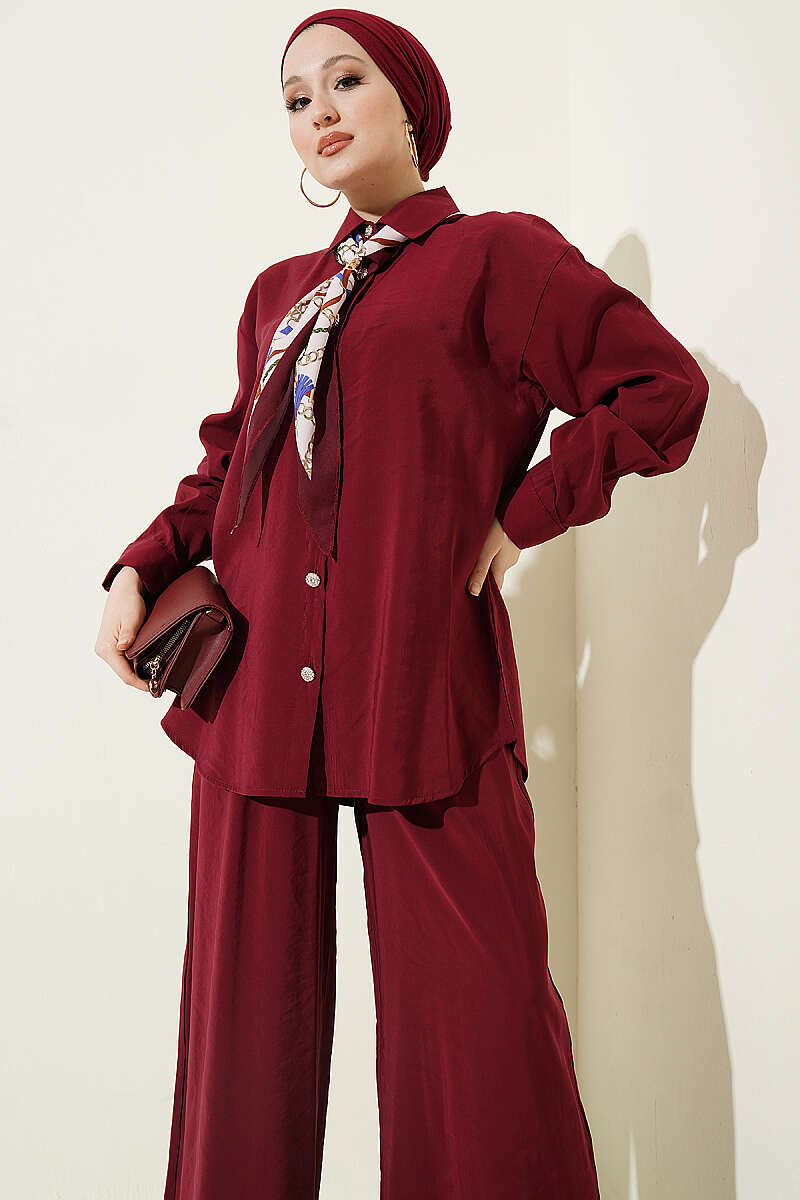 Taş Düğmeli Fularlı Modal İkili Takım Bordo