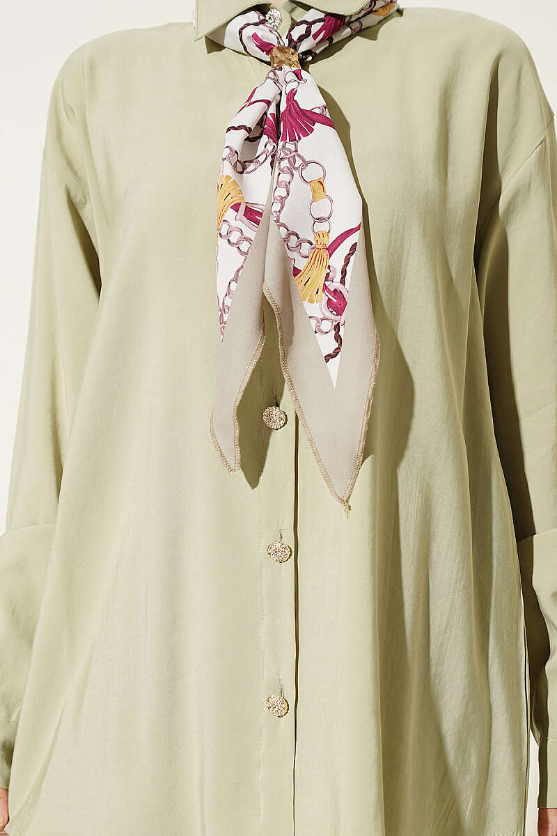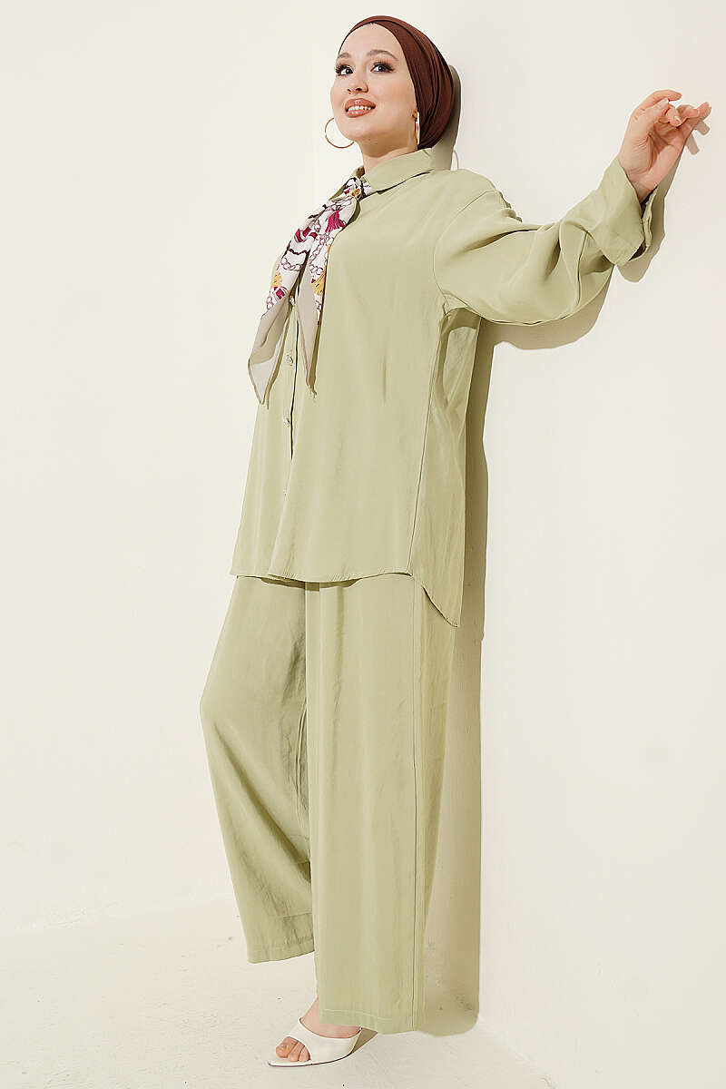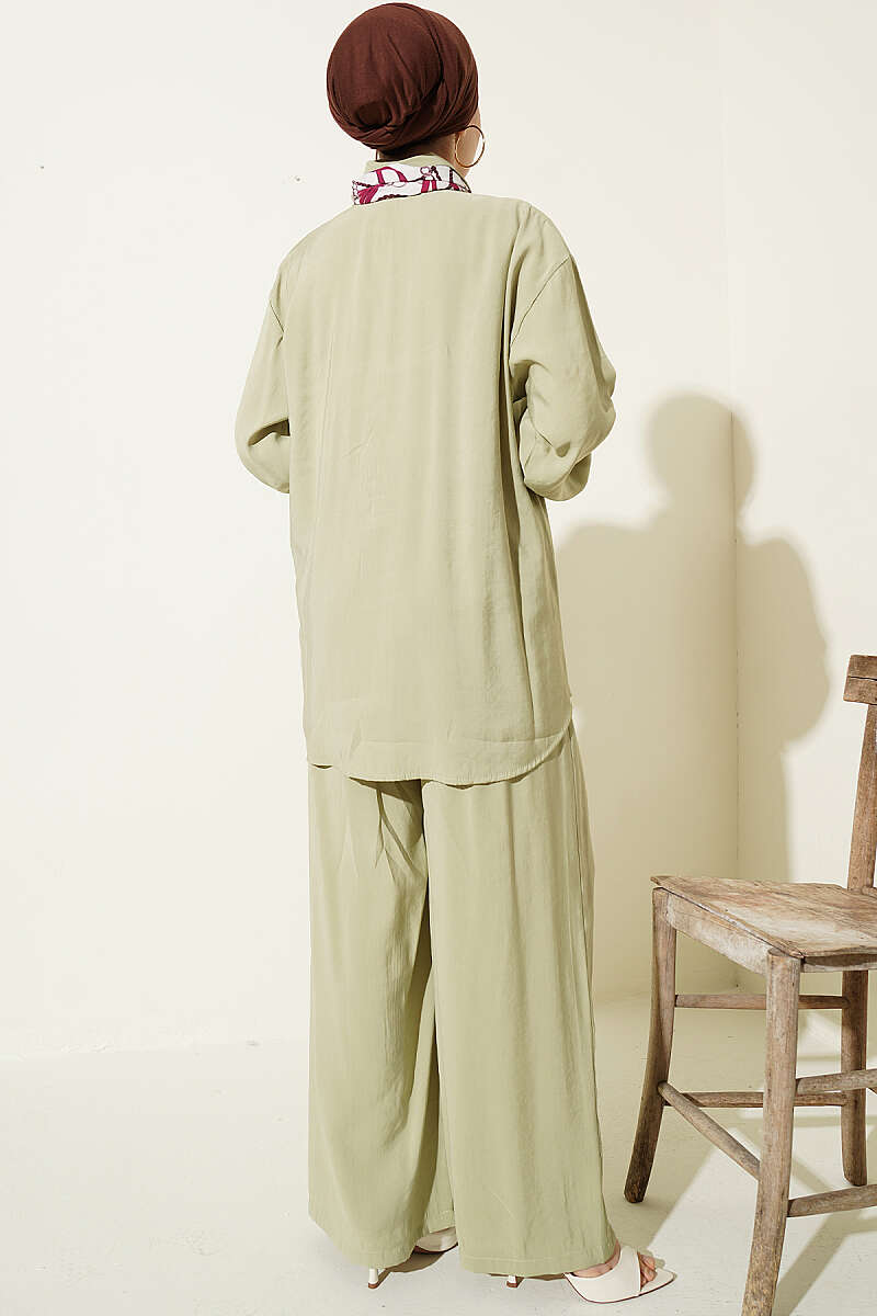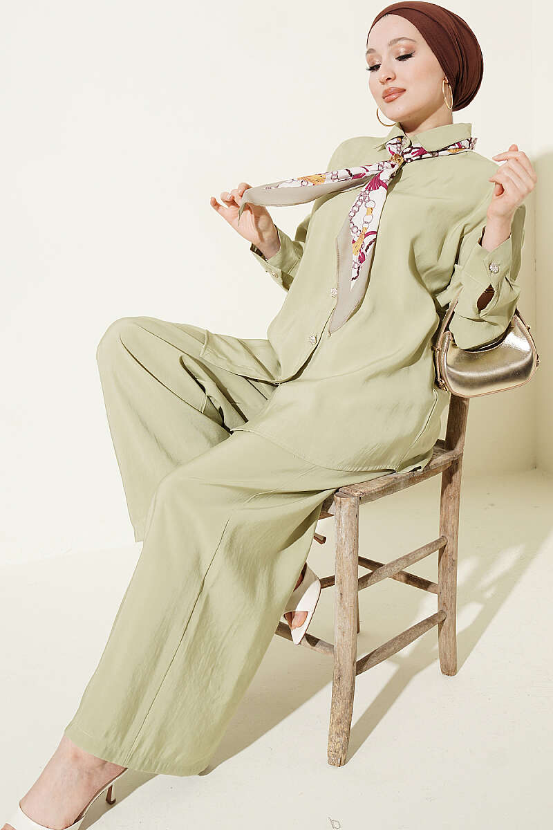 Taş Düğmeli Fularlı Modal İkili Takım Çağla Yeşili