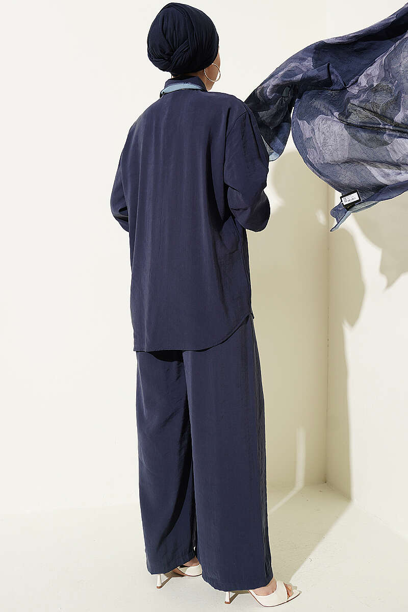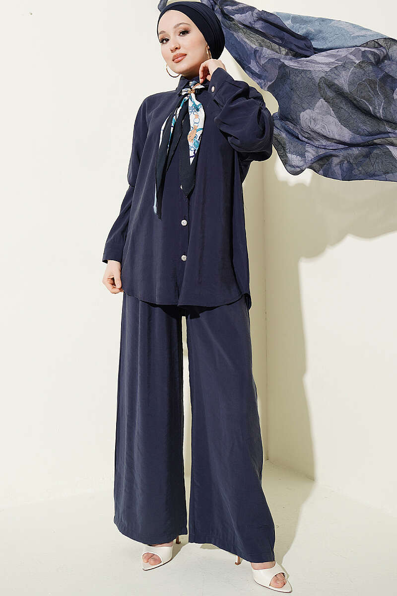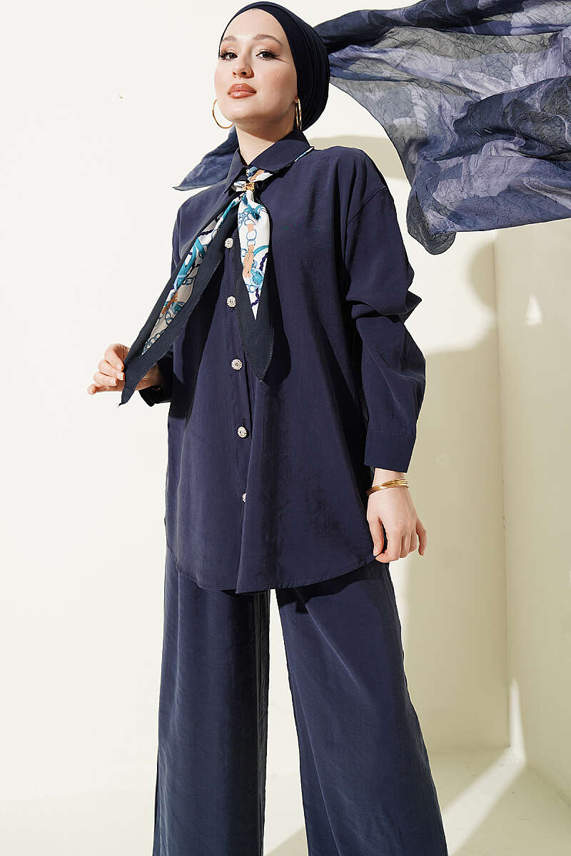 Taş Düğmeli Fularlı Modal İkili Takım Lacivert