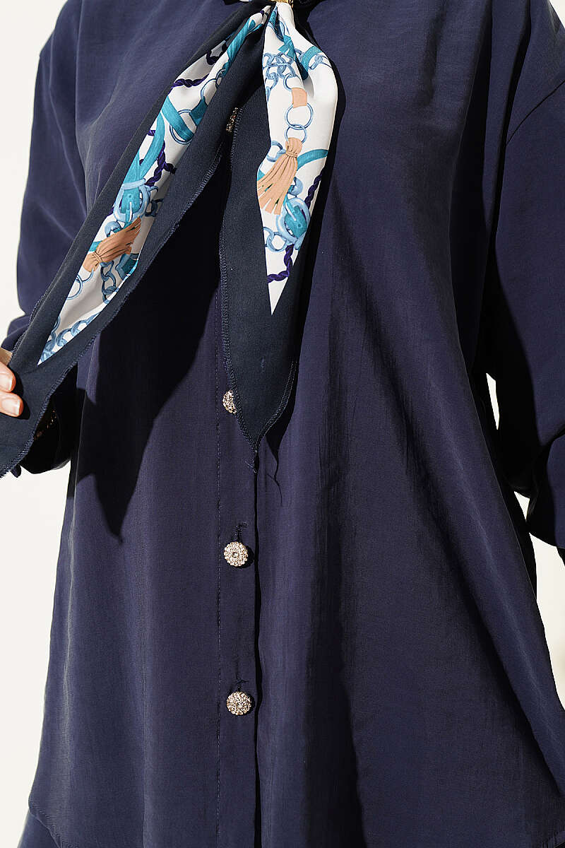 Düğmeli Fularlı Uzun Tunik İndigo