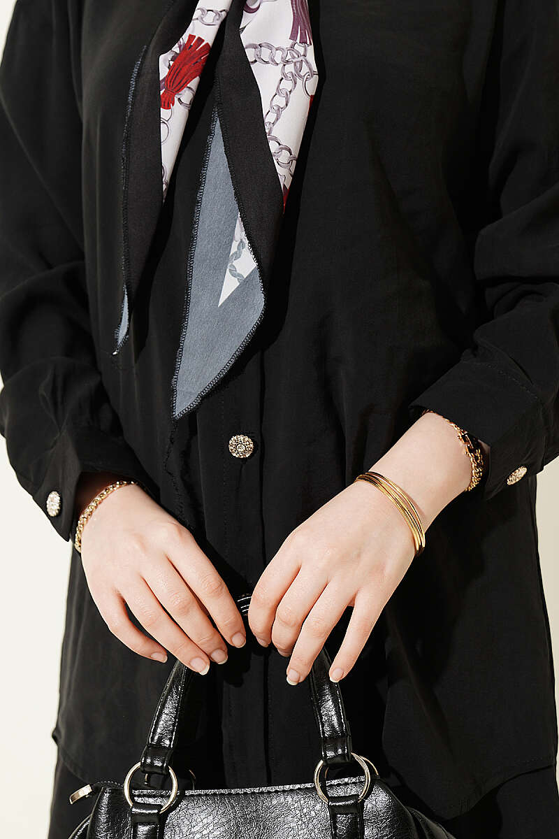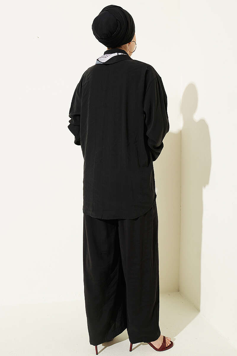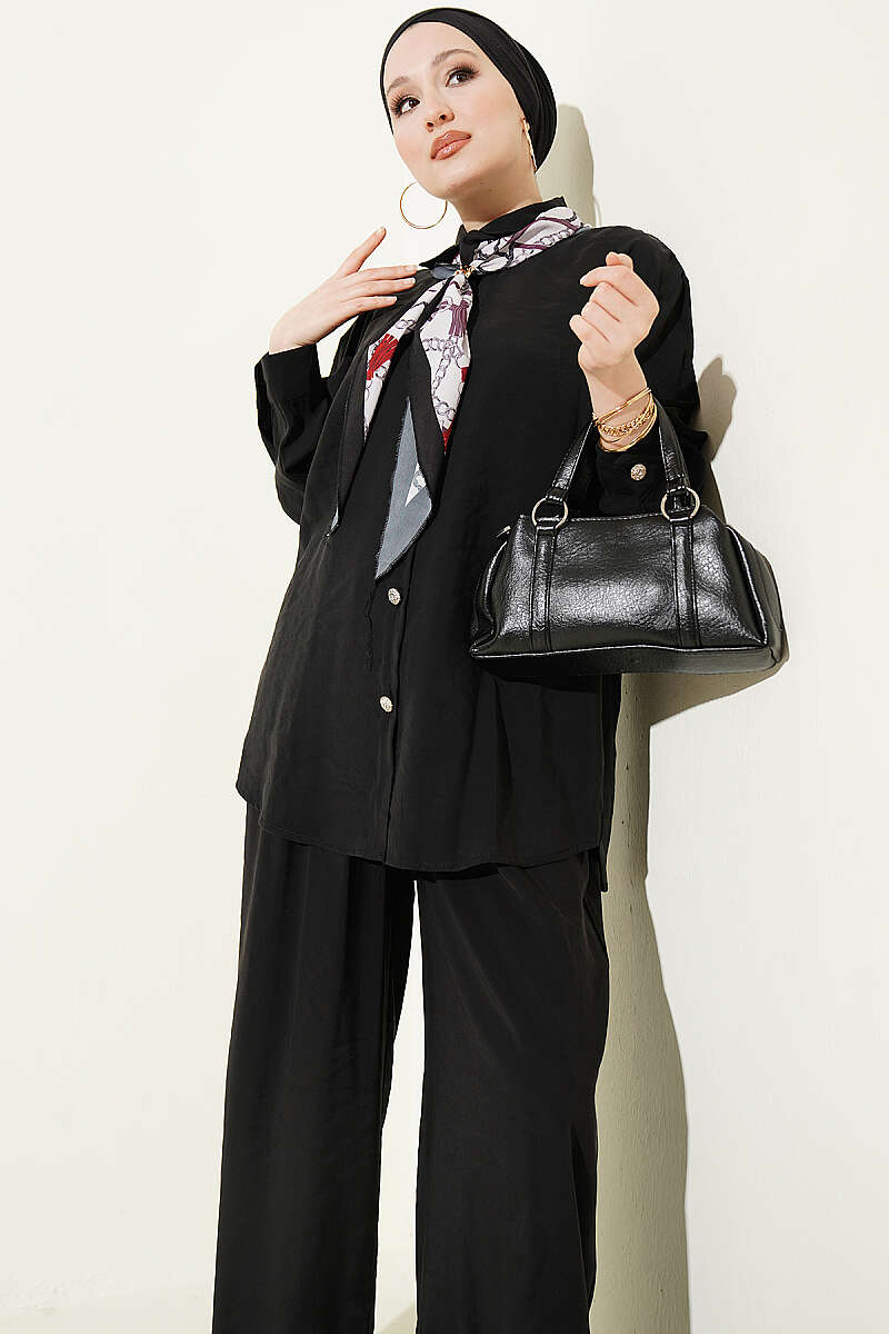 Taş Düğmeli Fularlı Modal İkili Takım Siyah