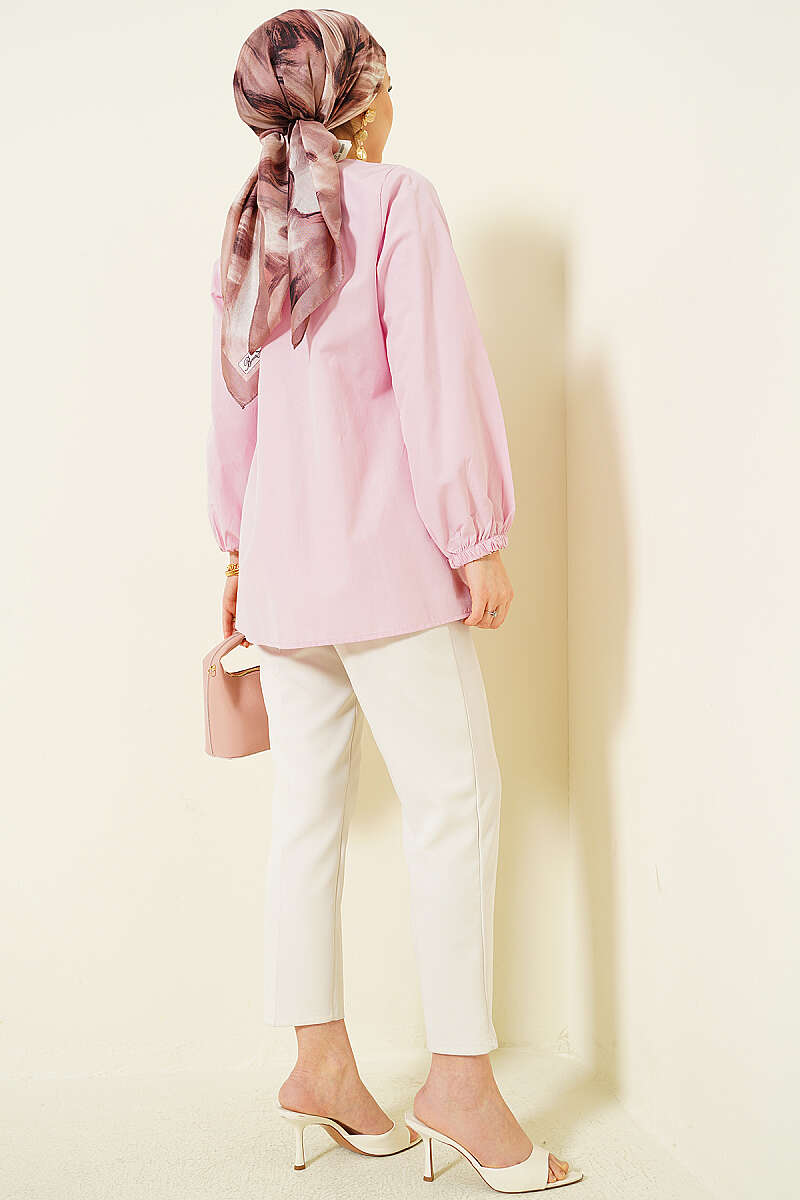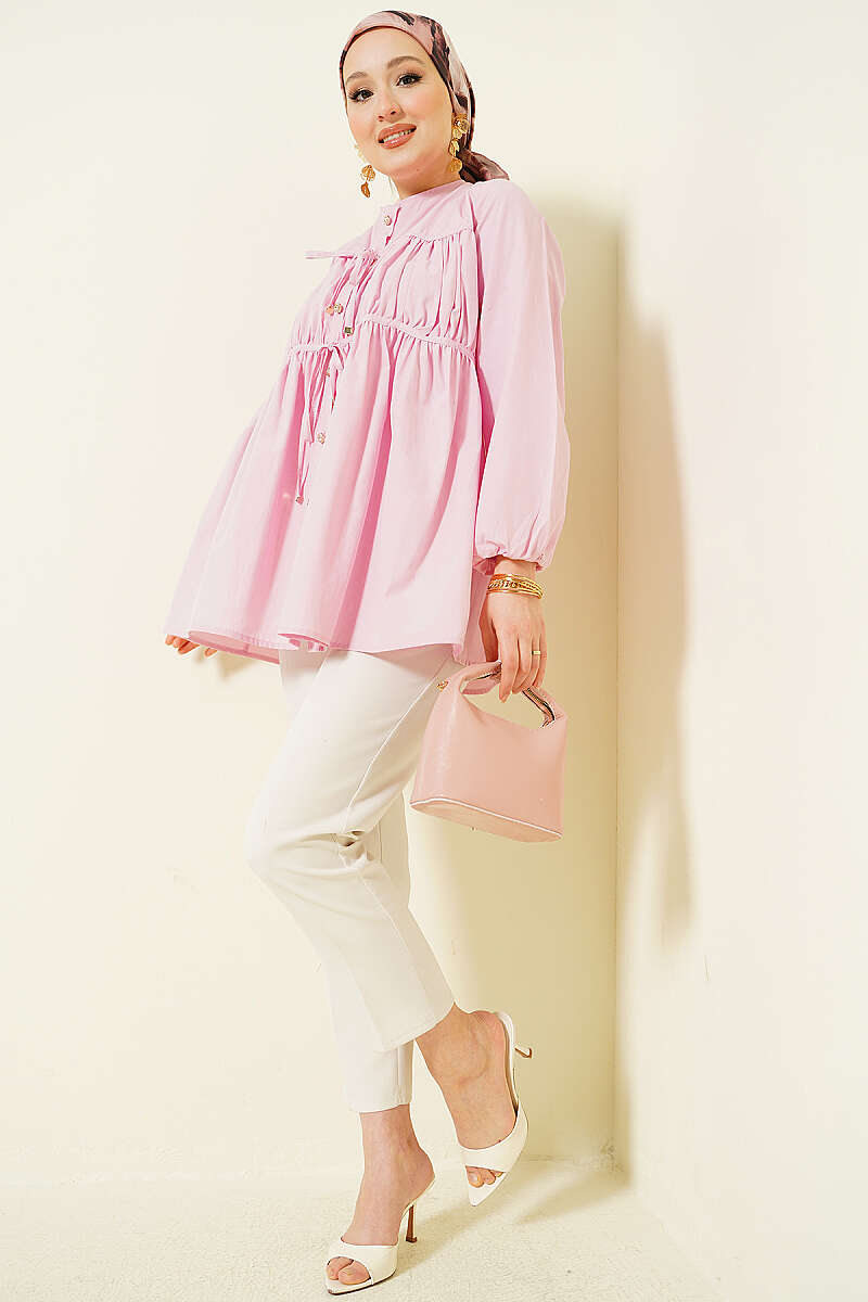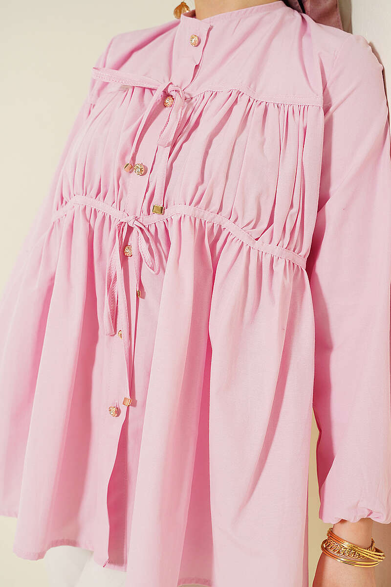Taş Düğmeli İp Bağlamalı Gömlek Pembe