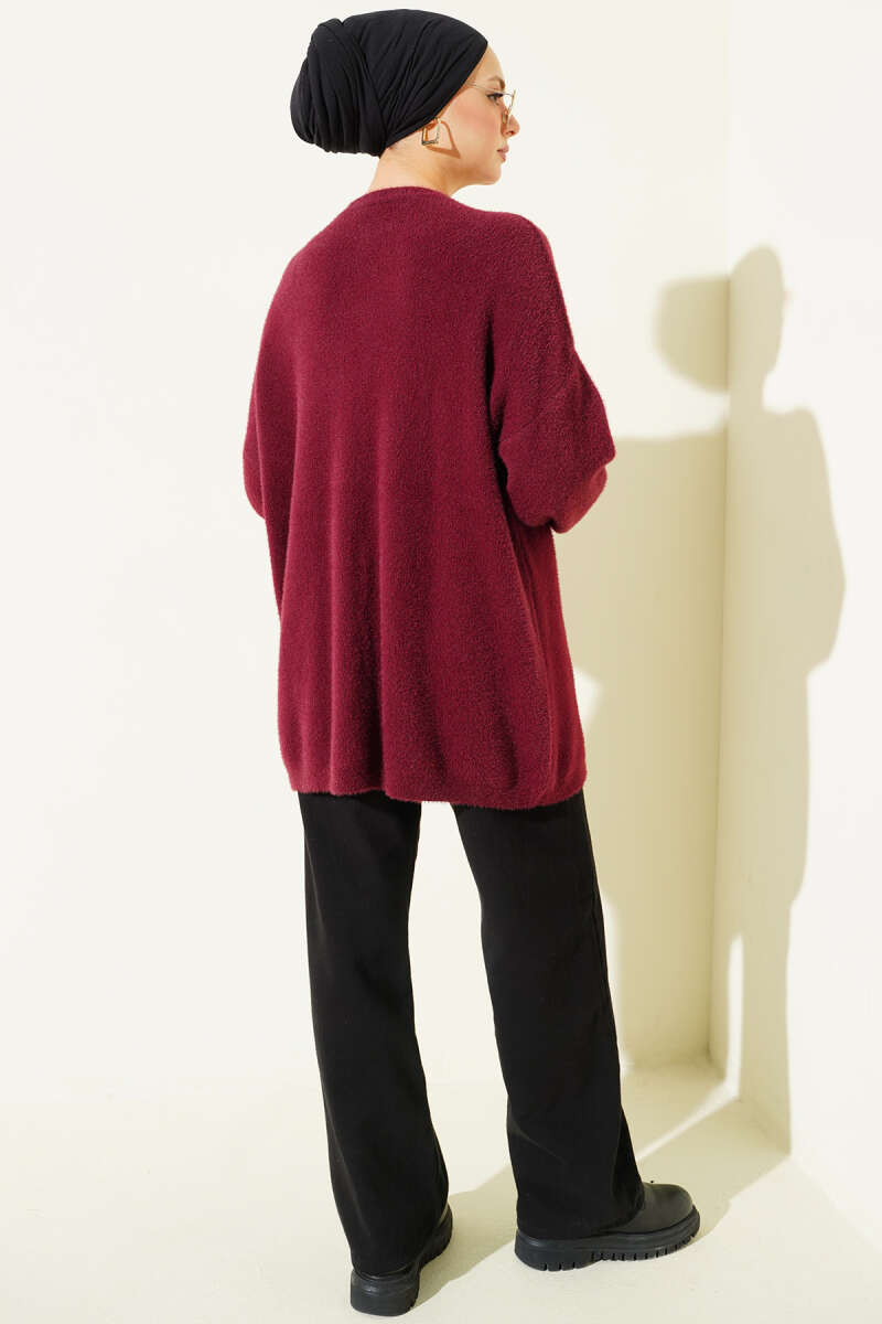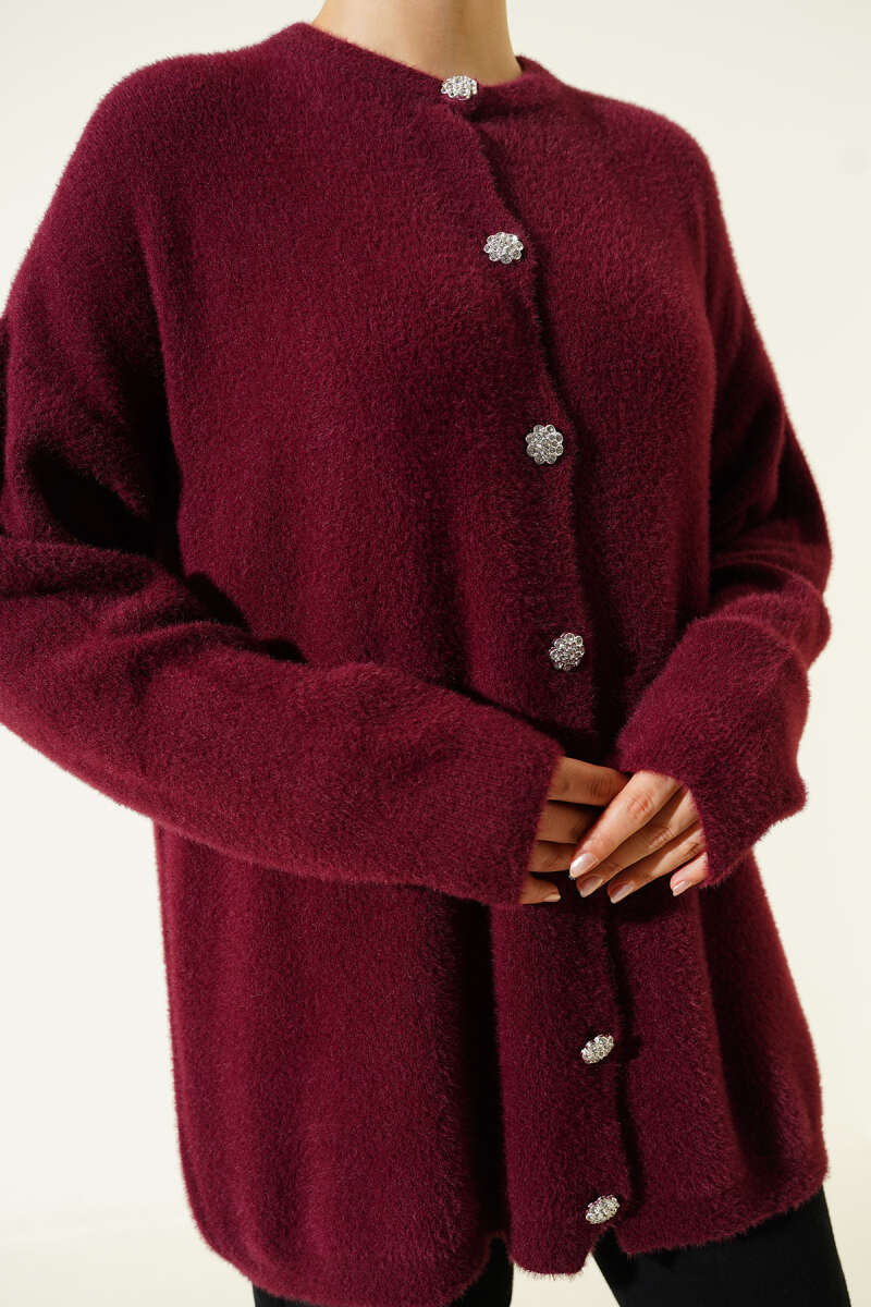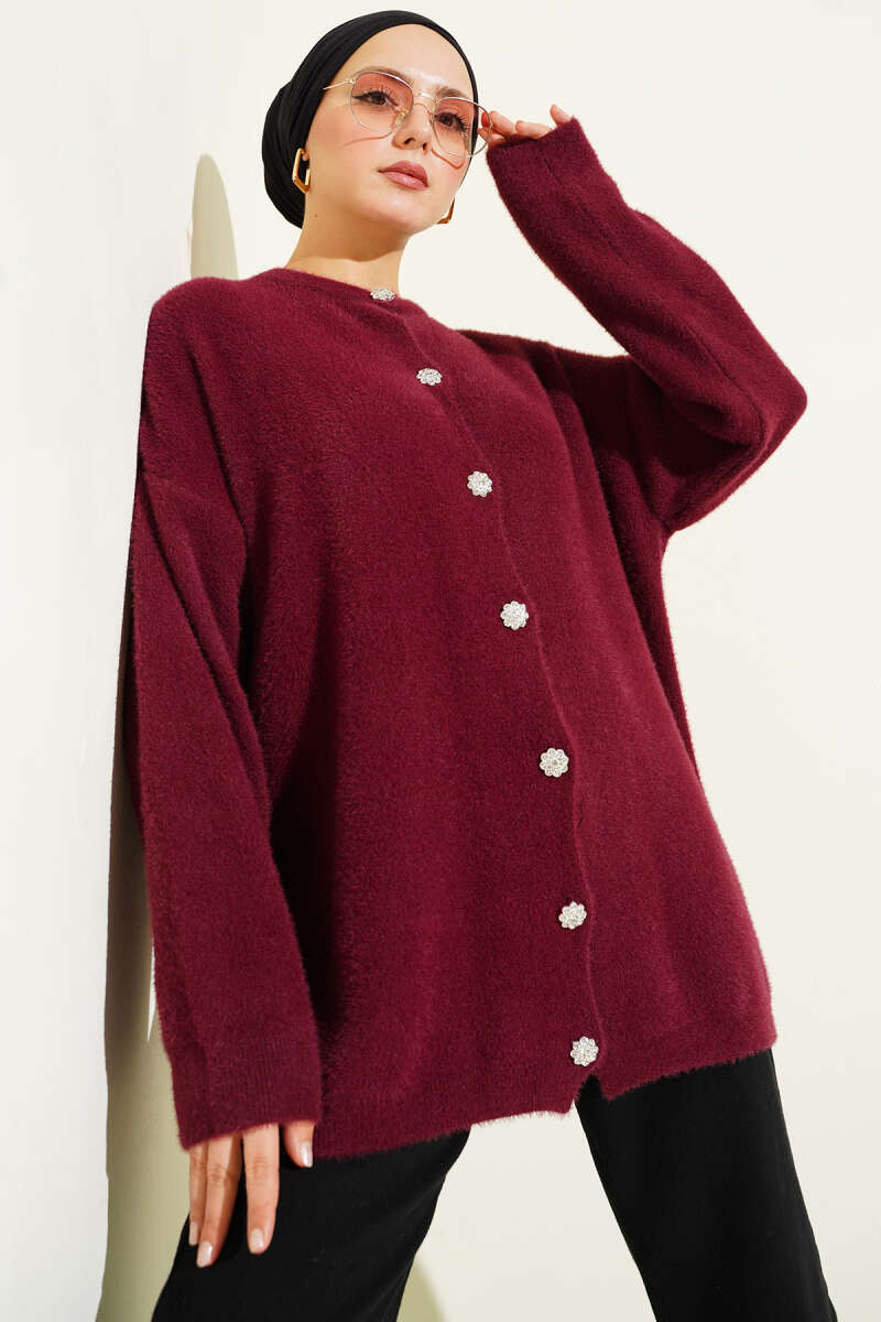 Taş Düğmeli Sakallı Yumoş Hırka Bordo