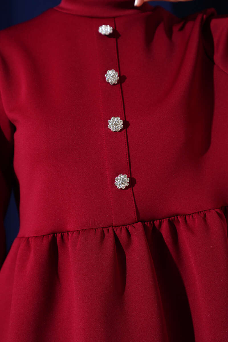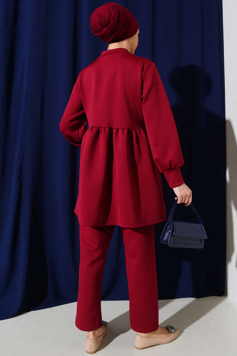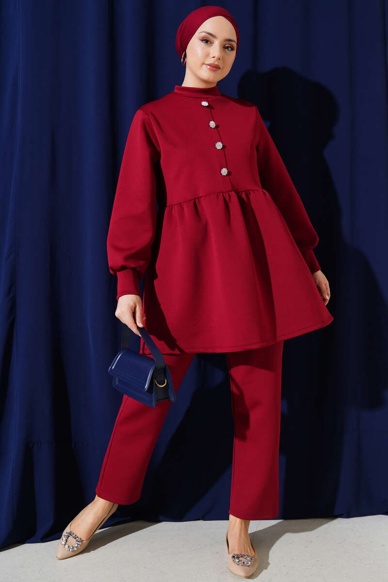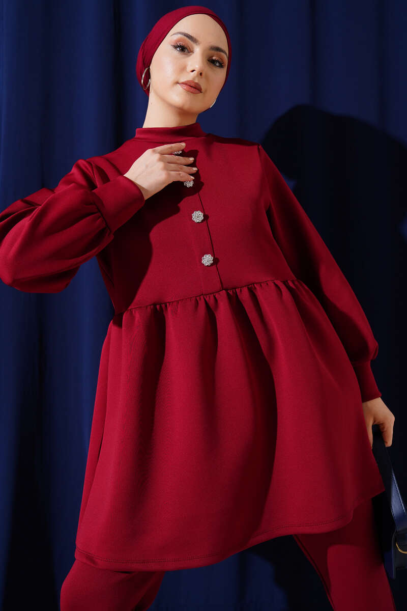 Taş Düğmeli Scuba İkili Takım Bordo