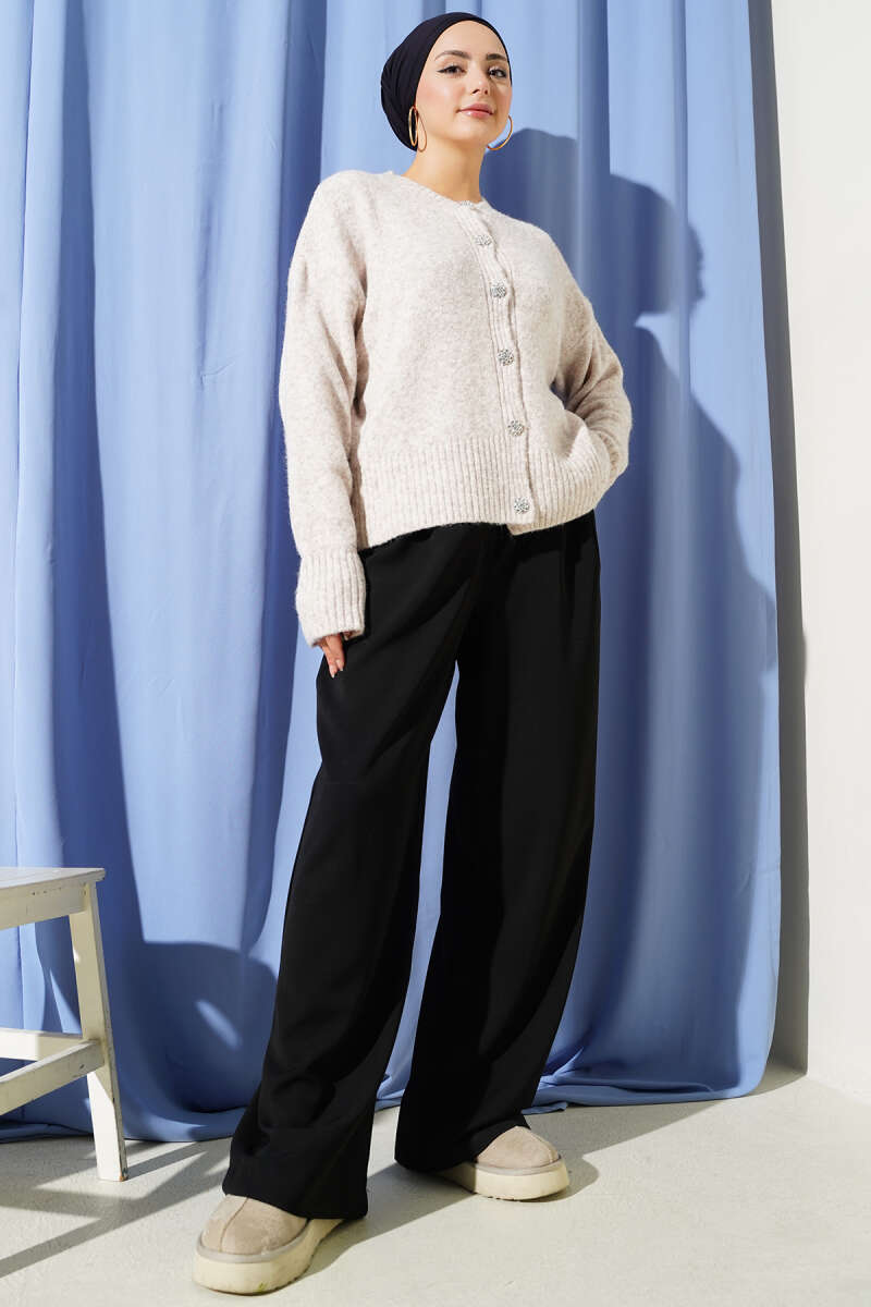 Baklava Desen Sakallı Düğmeli Triko Hırka Siyah