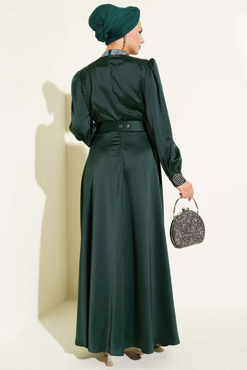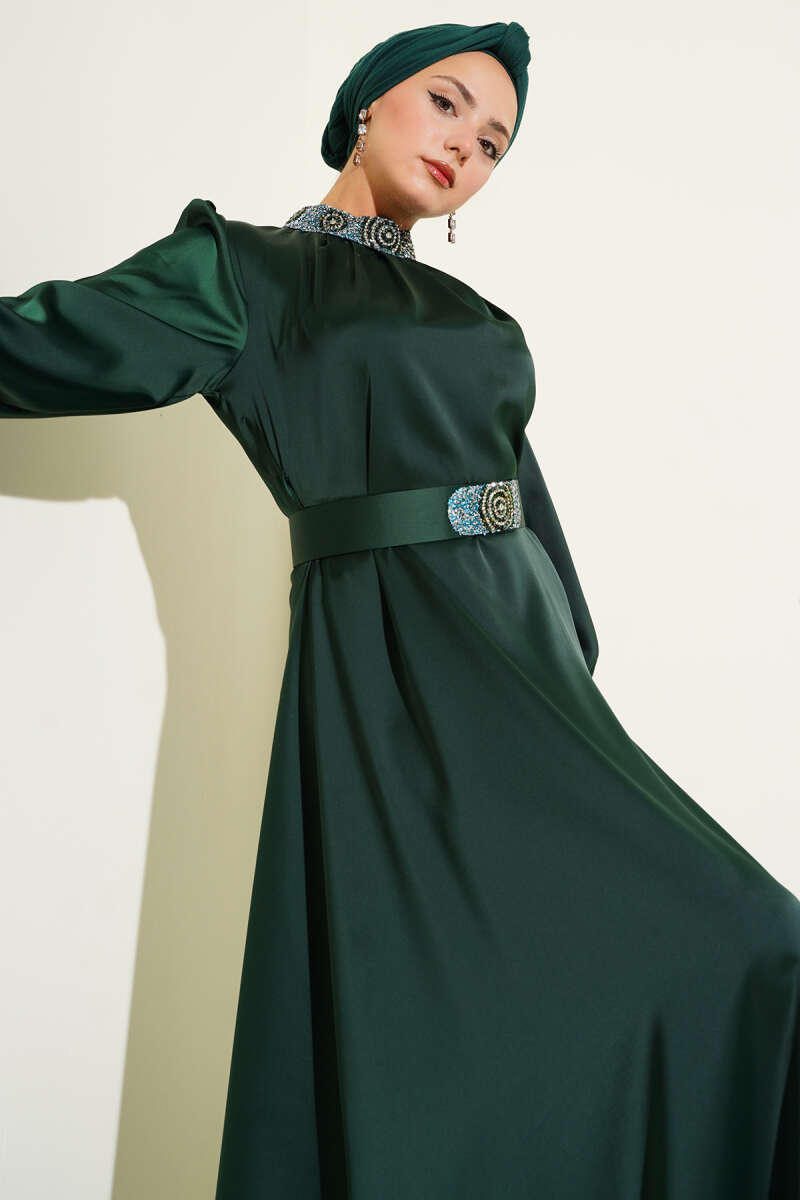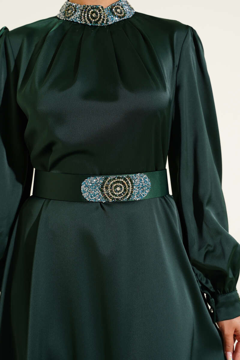 Yan Büzgülü Gold Tokalı Saten Abiye Zümrüt Yeşili