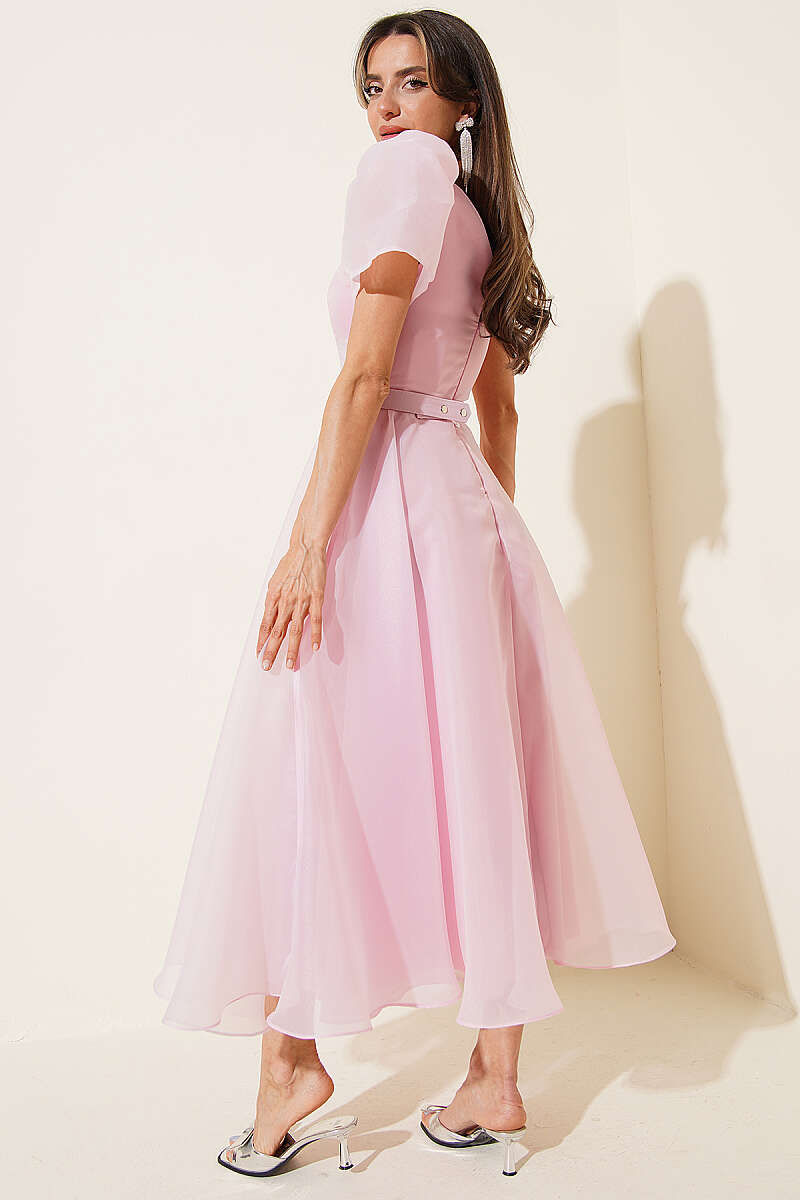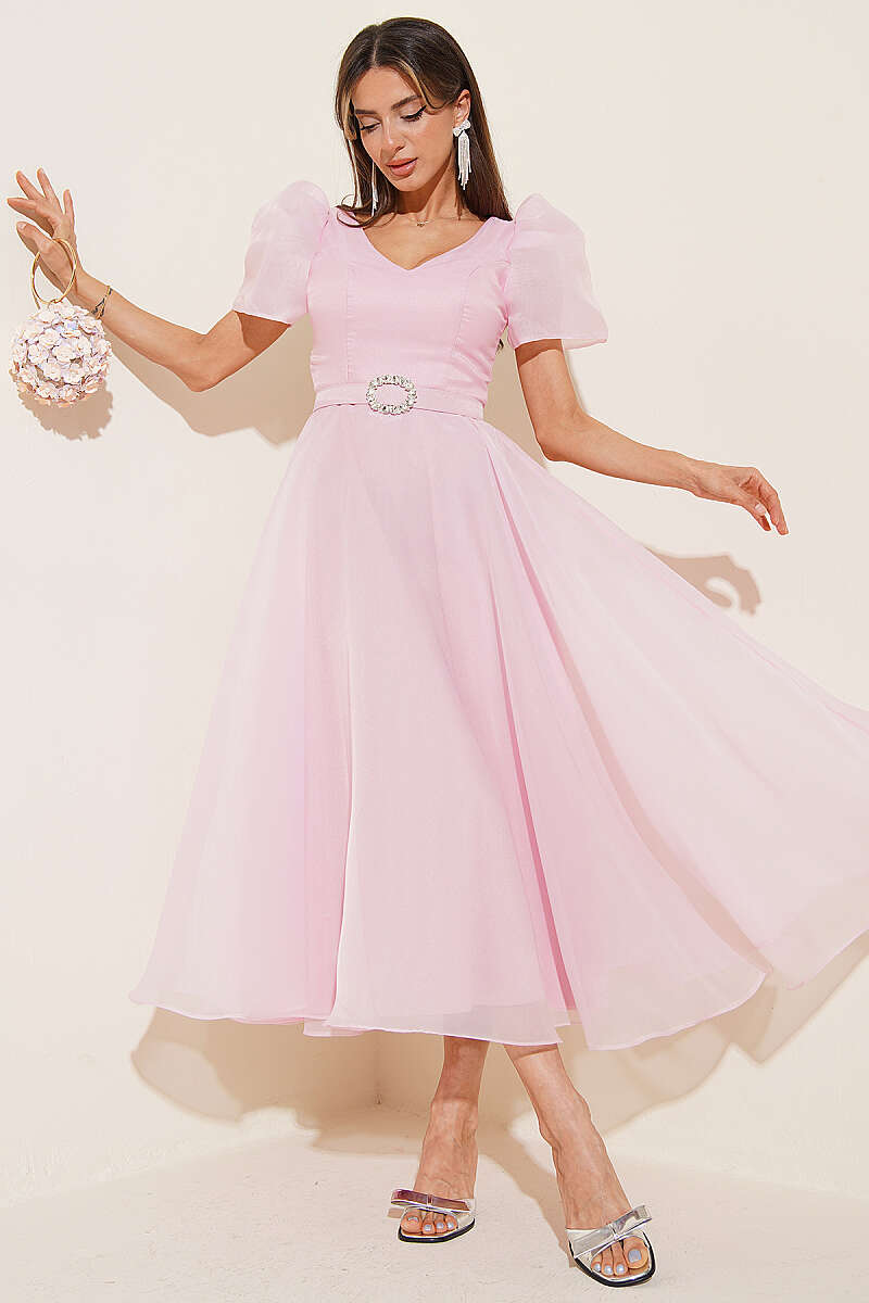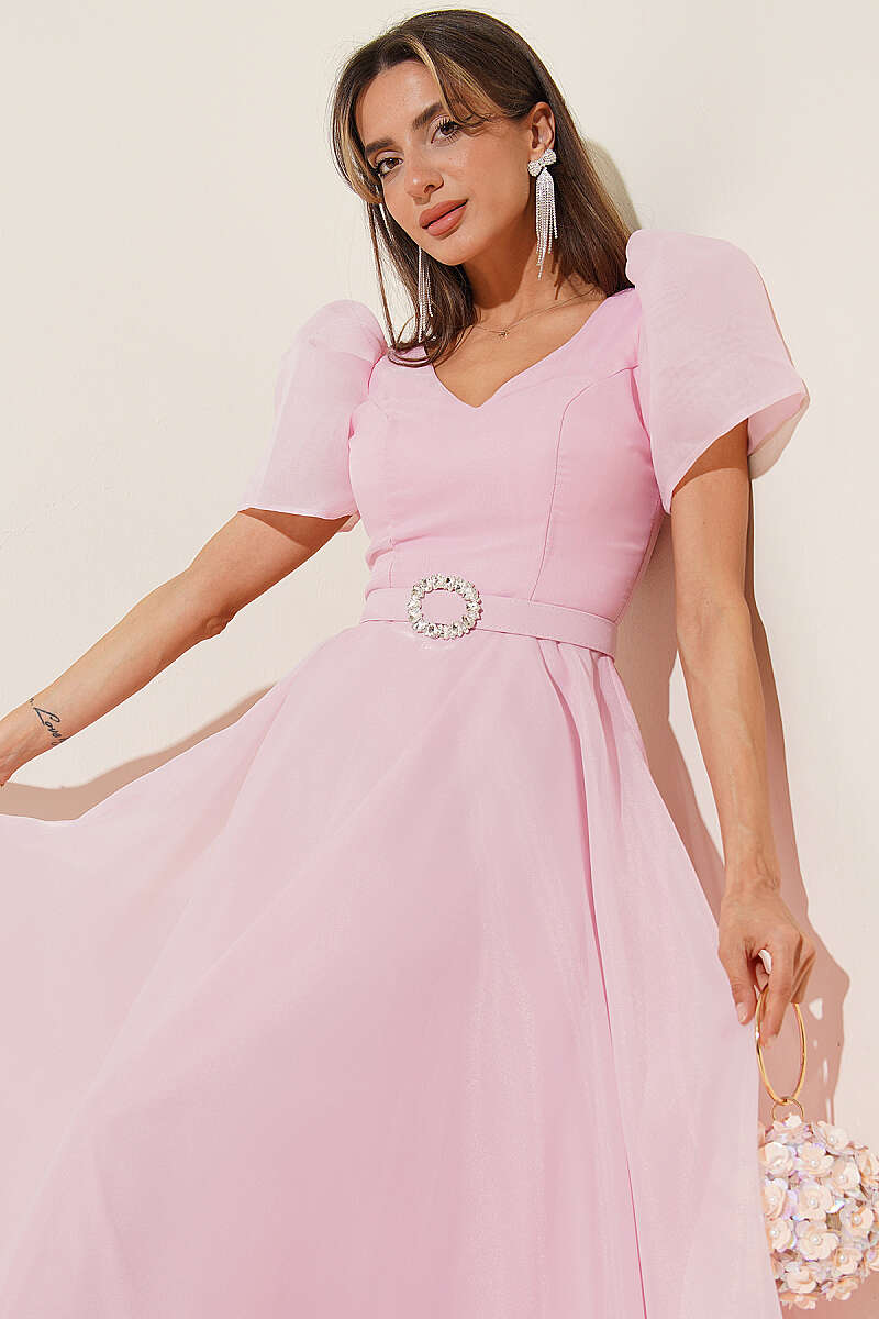Taş Kemerlli Prenses Abiye Elbise Pudra