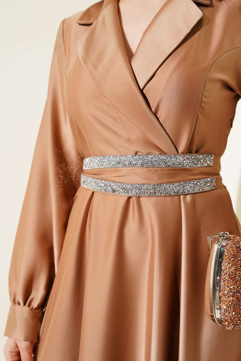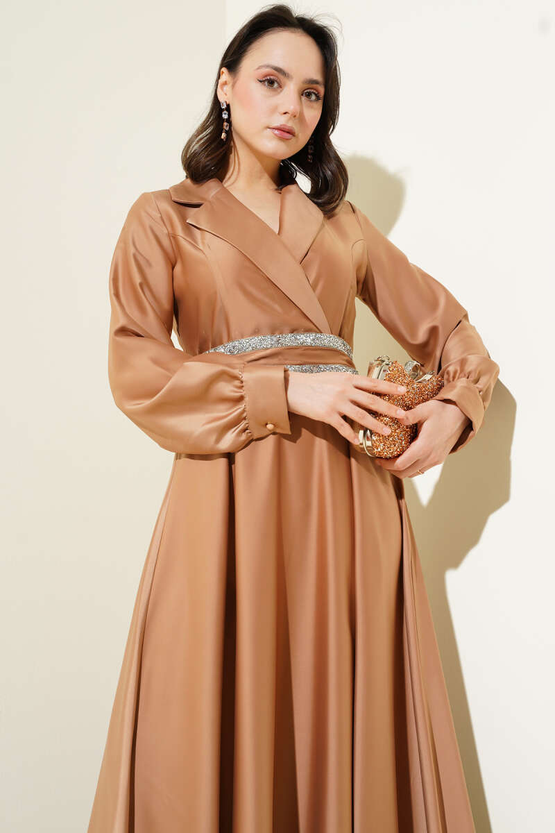 Gold Düğme Detaylı Saten Abiye Kahve
