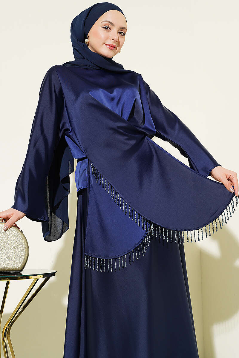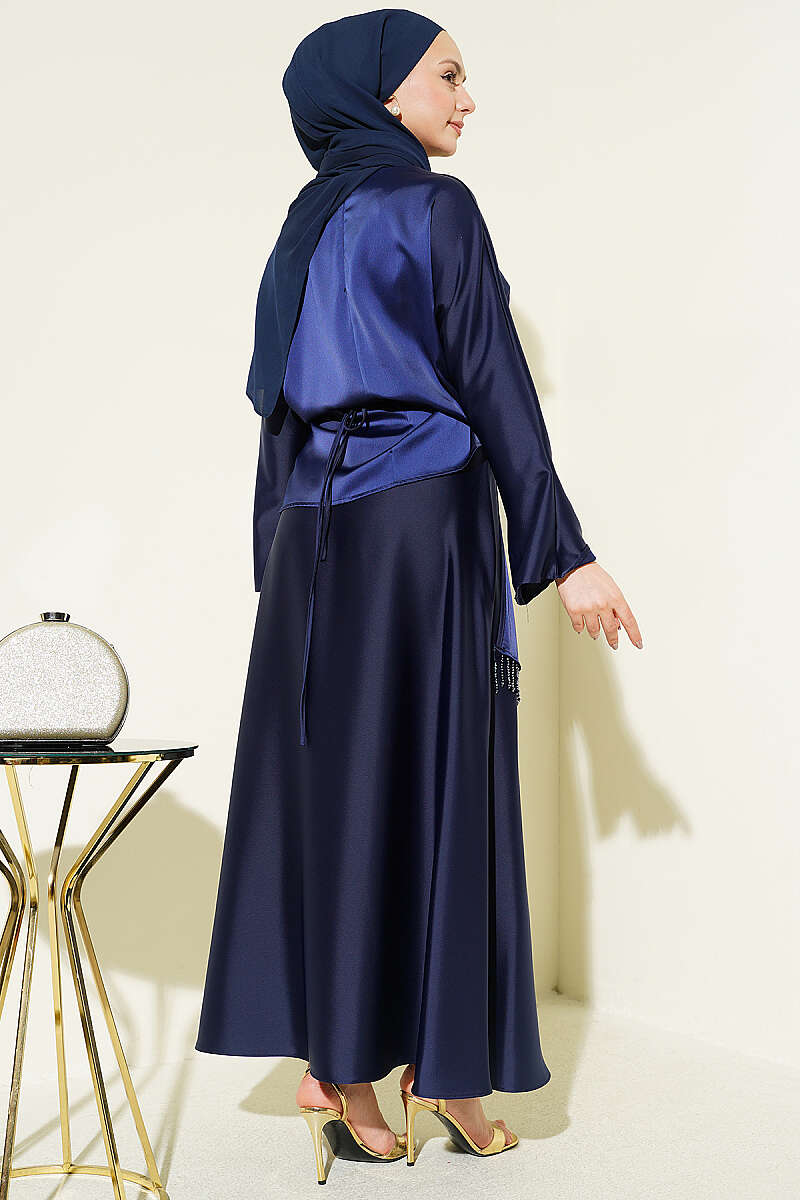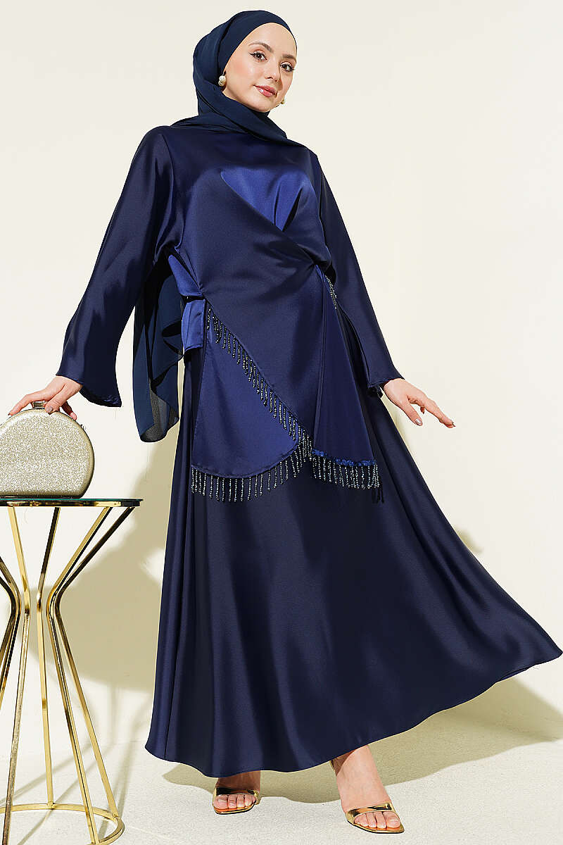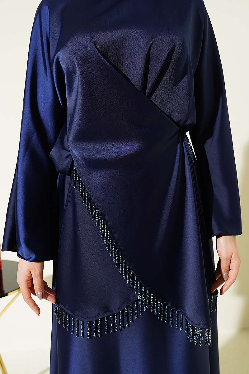 Taş Püsküllü Saten Etekli Takım Lacivert