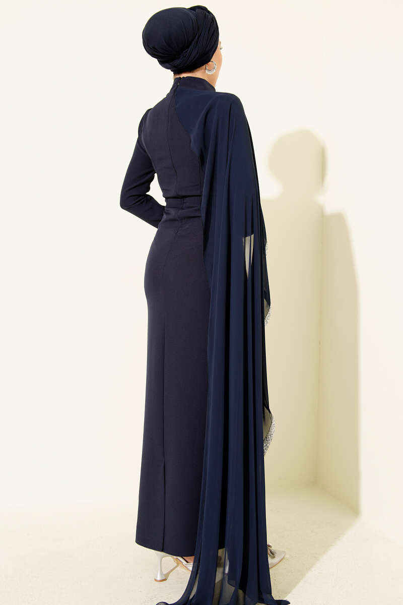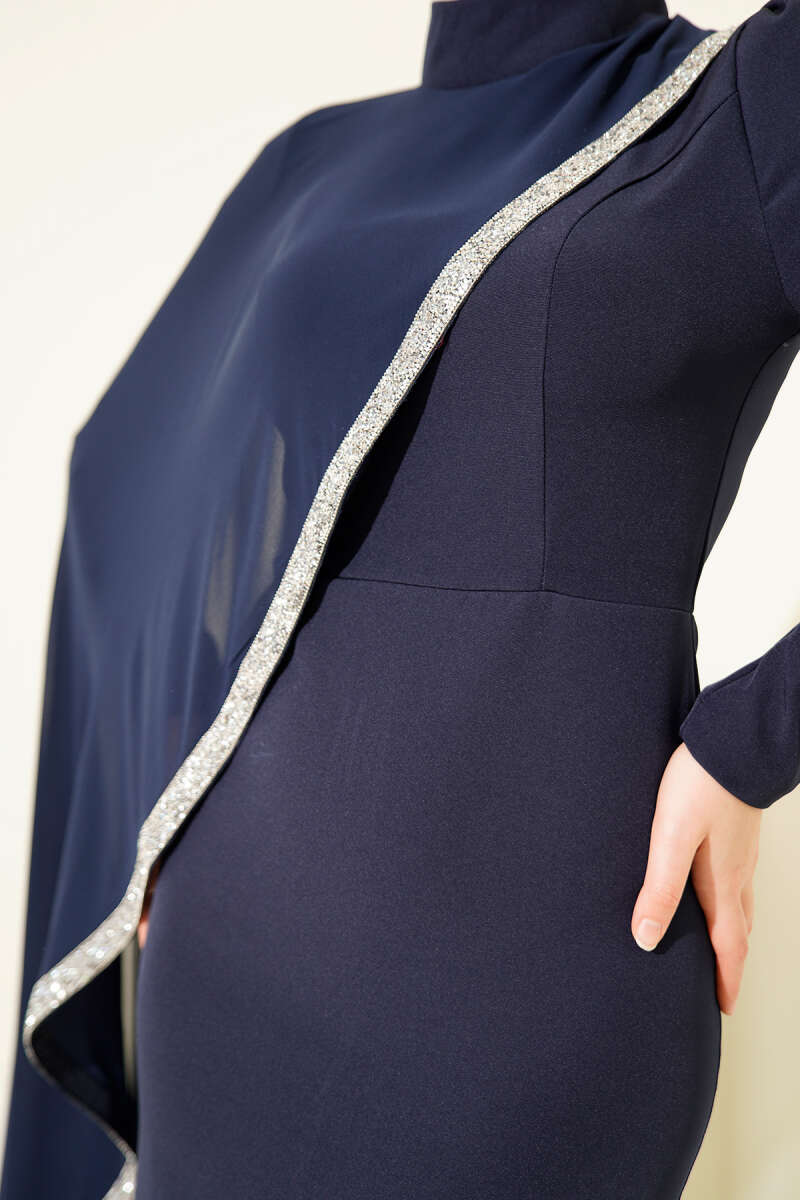 Bel Taşlı Pul Payet Detaylı Abiye Elbise Lacivert