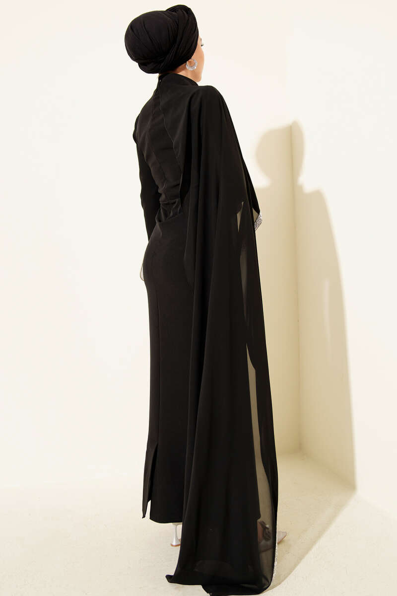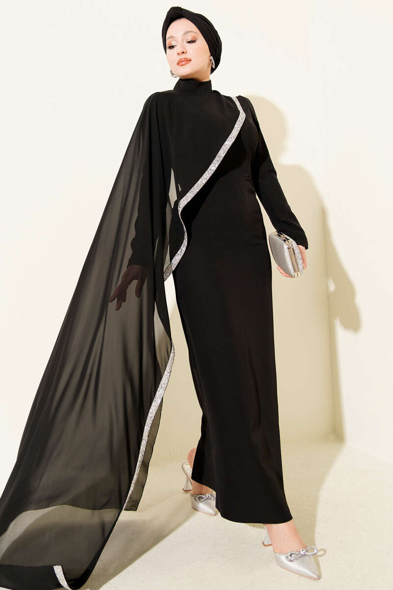 Taş Şeritli Tül Pelerinli Abiye Elbise Lacivert