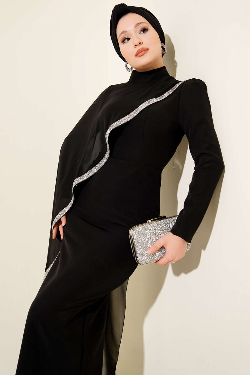 Bel Taşlı Pul Payet Detaylı Abiye Elbise Siyah
