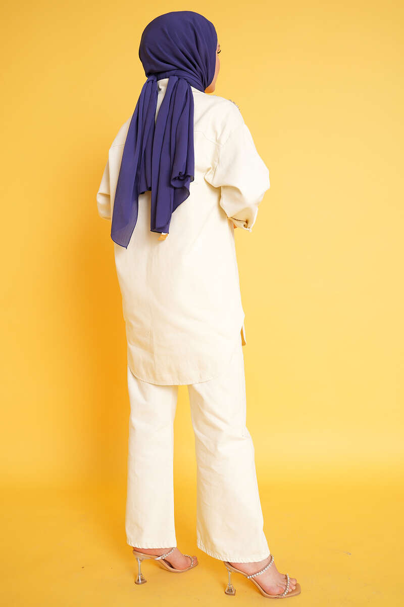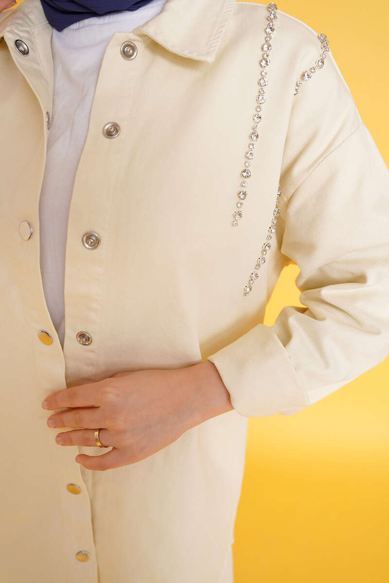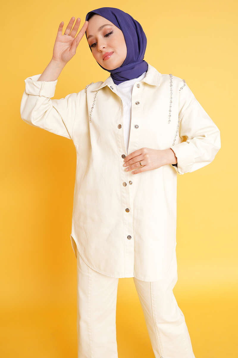 Taş Süsleme Denim İkili Takım Ekru