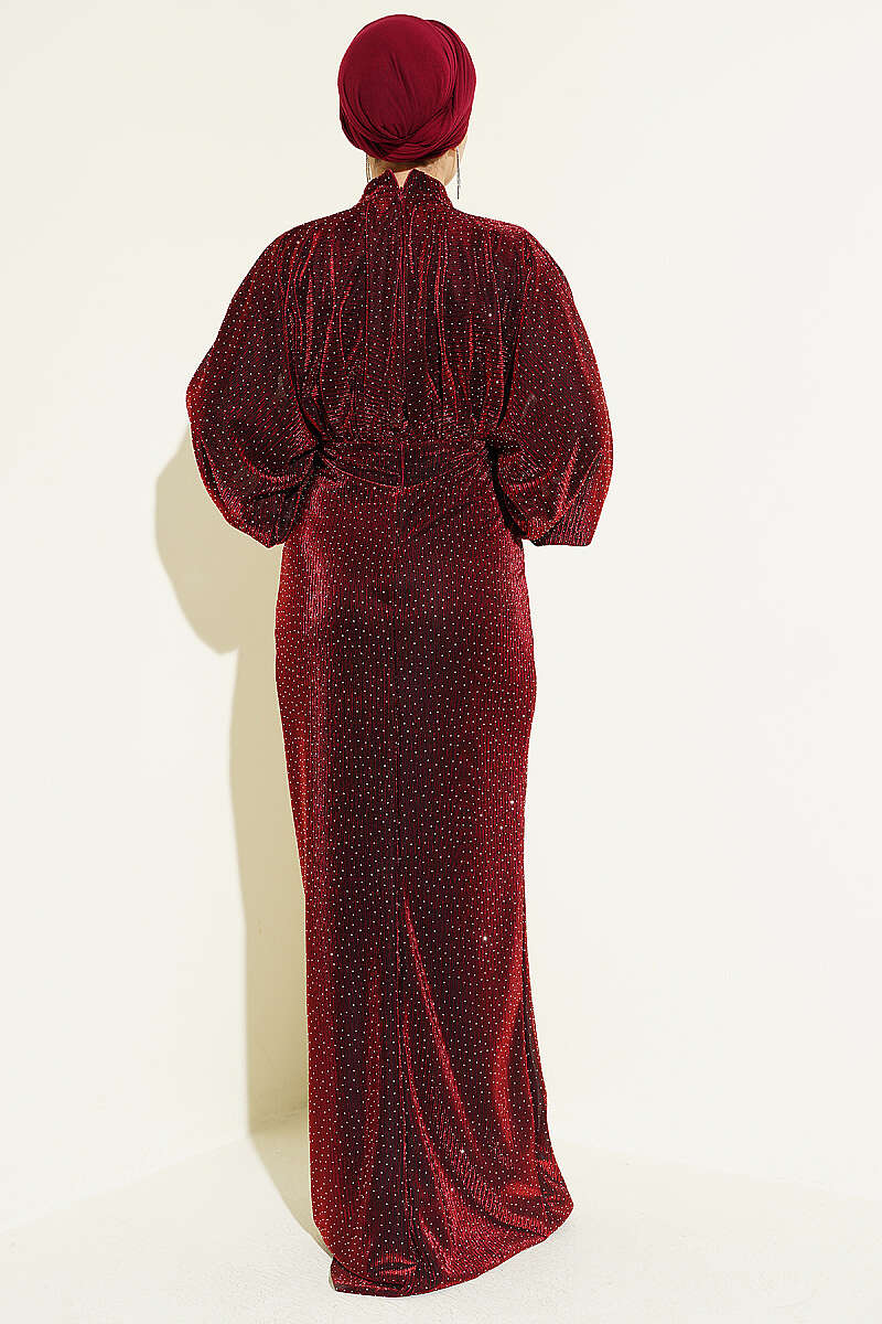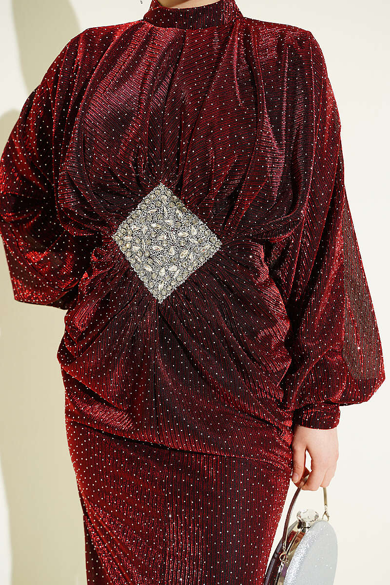 Taş Süslemeli Bel Taş Büzgülü Abiye Bordo