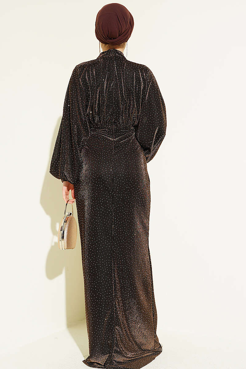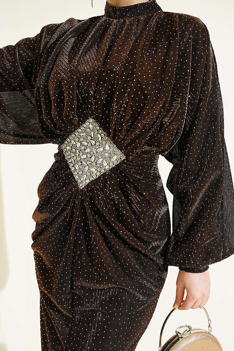 Taş Süslemeli Bel Taş Büzgülü Abiye Kahve