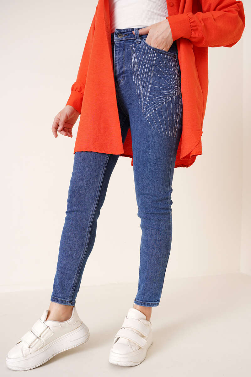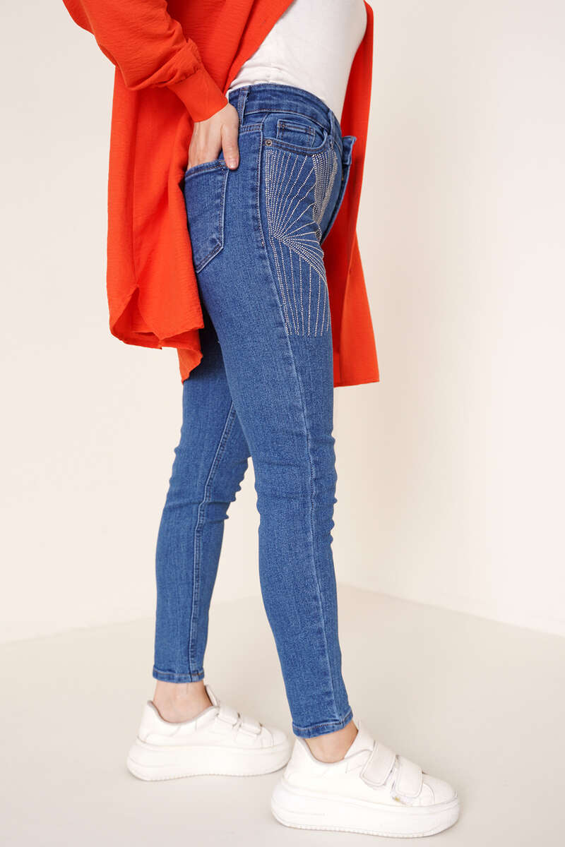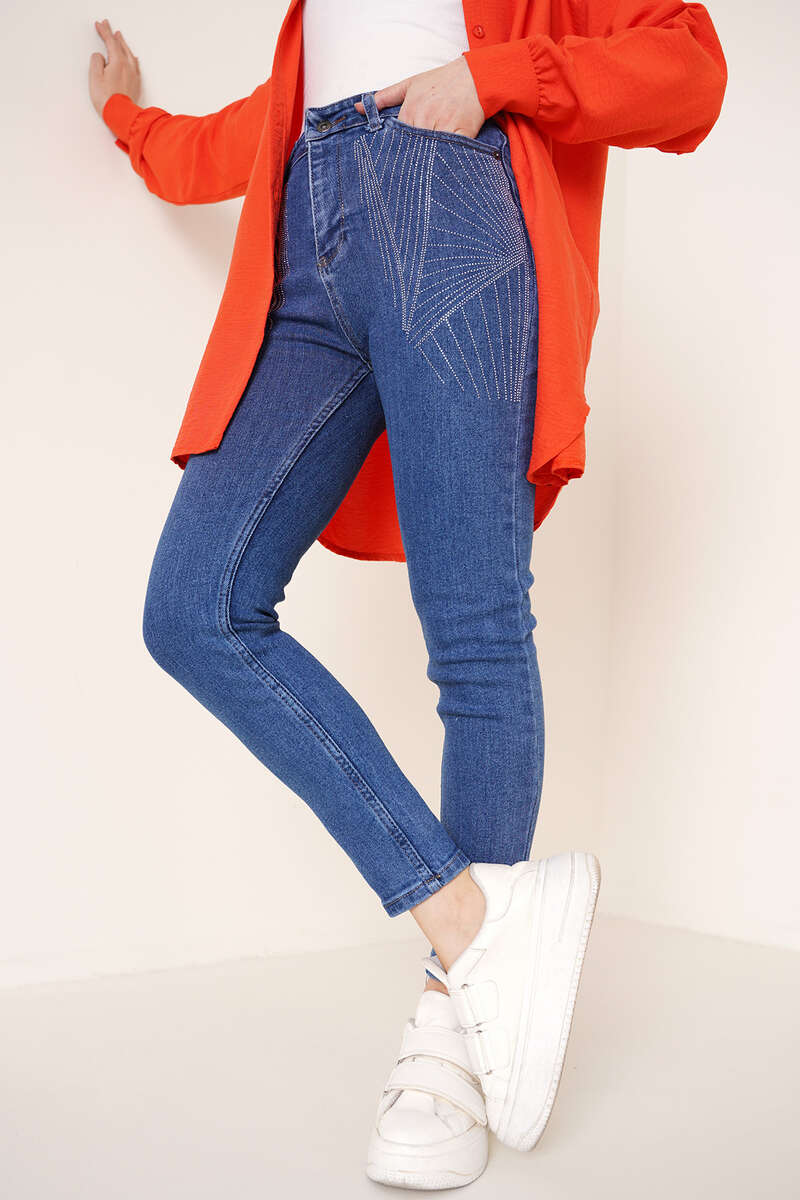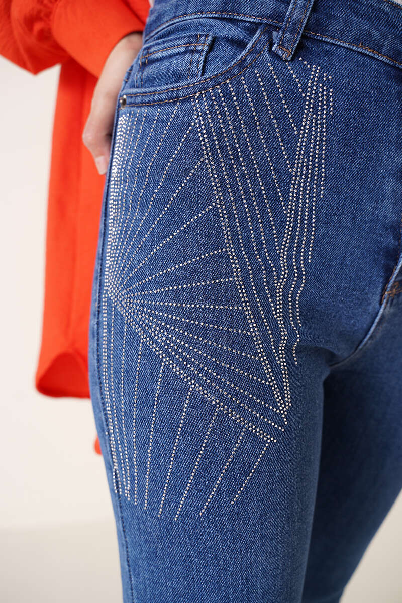 Taş Süslemeli Dar Paça Jean Pantolon Orta Kot