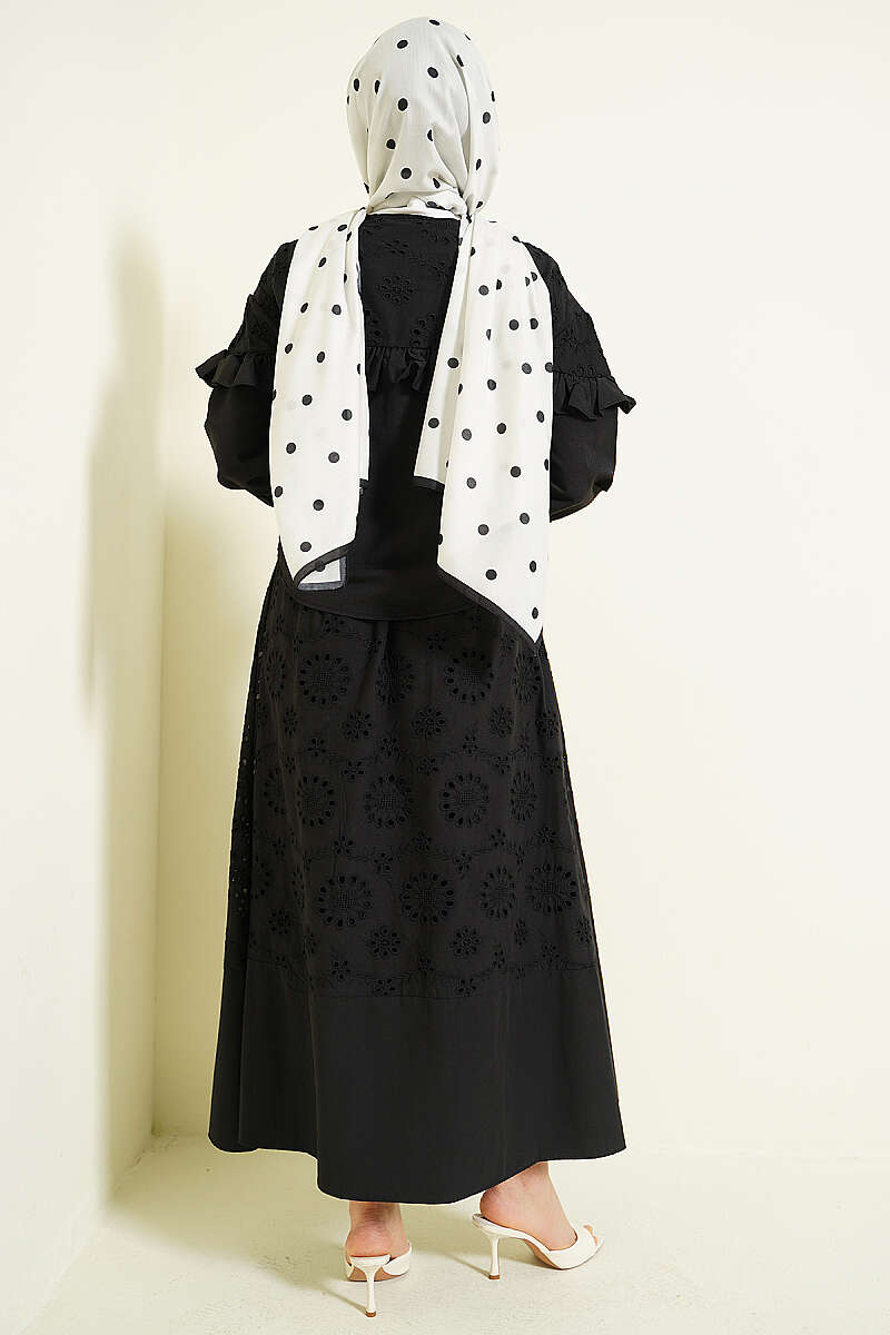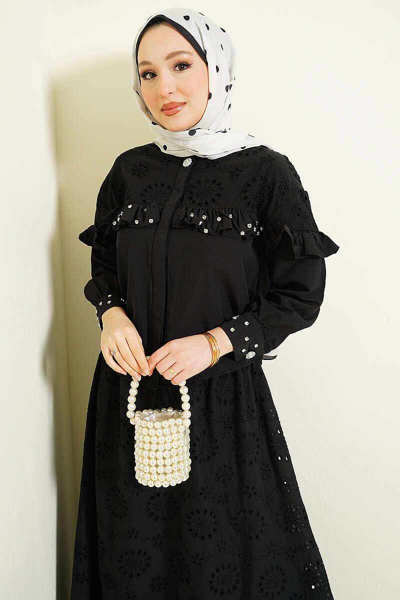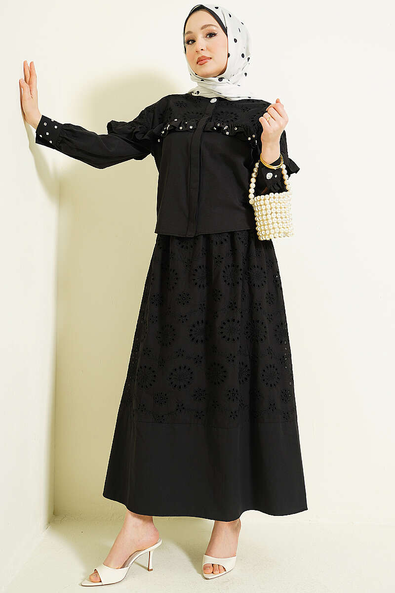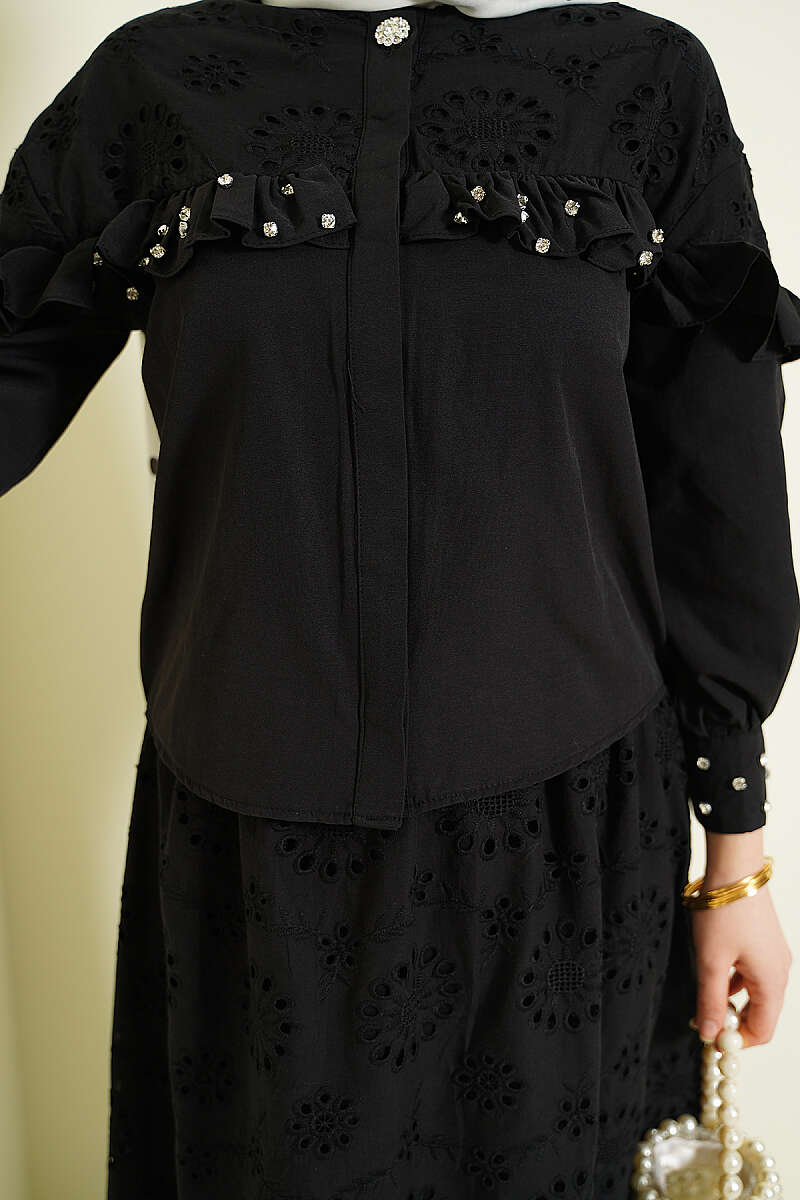 Taş Süslemeli Fırfırlı Brodeli Etekli İkili Takım Siyah