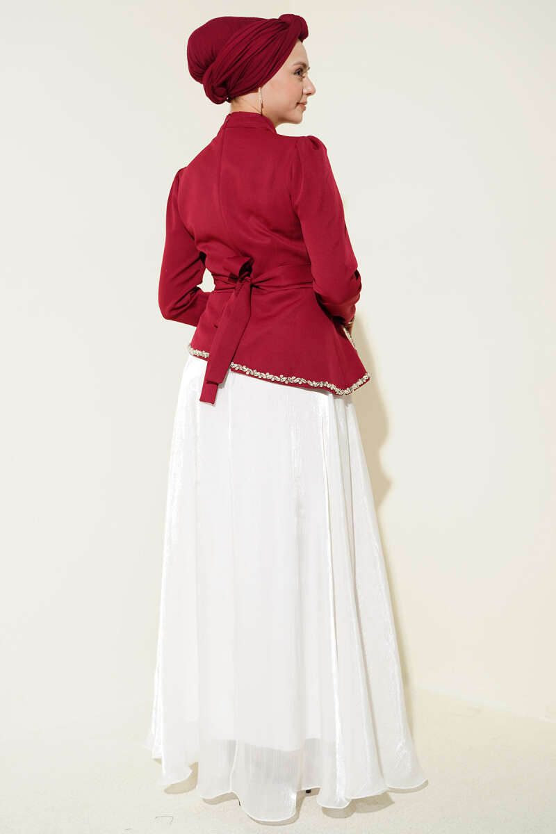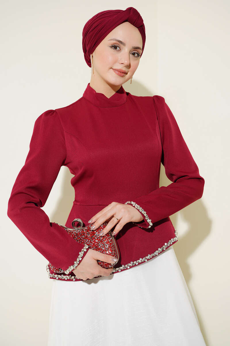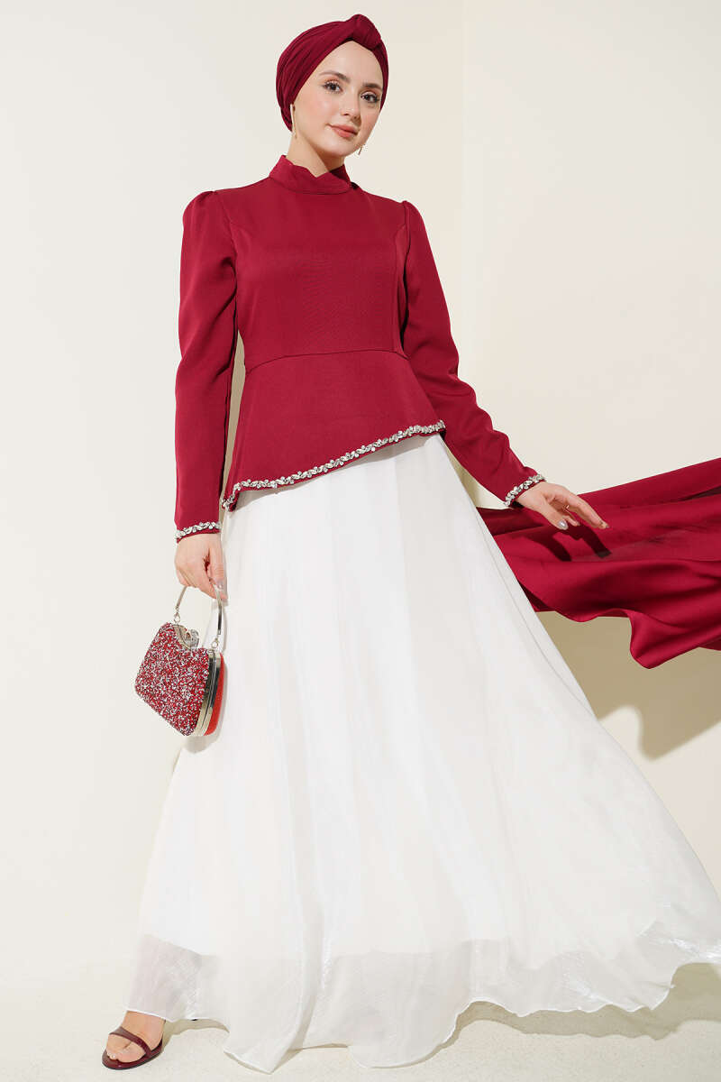 Taş Süslemeli Garnili Abiye Elbise Bordo