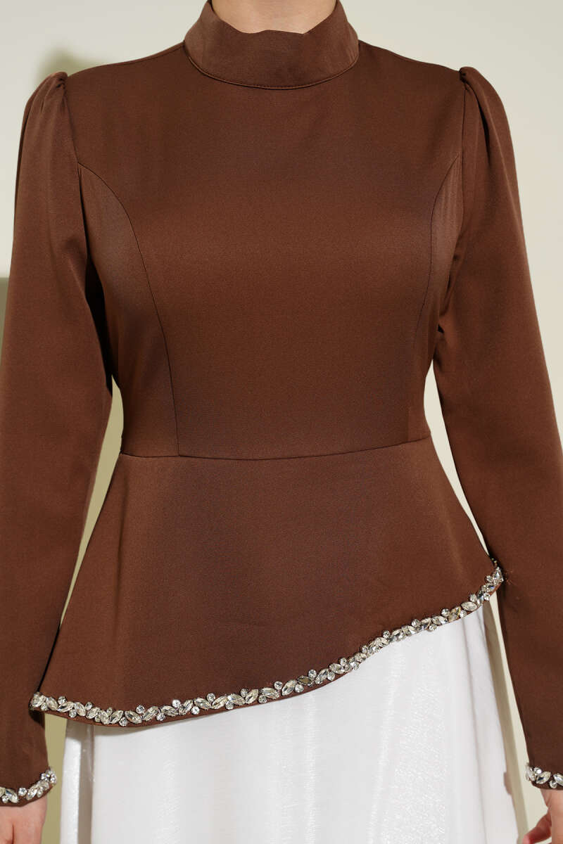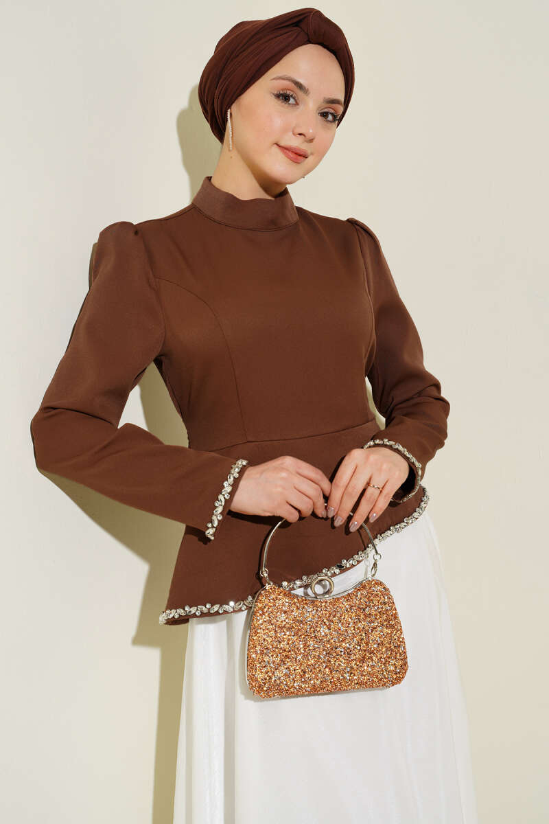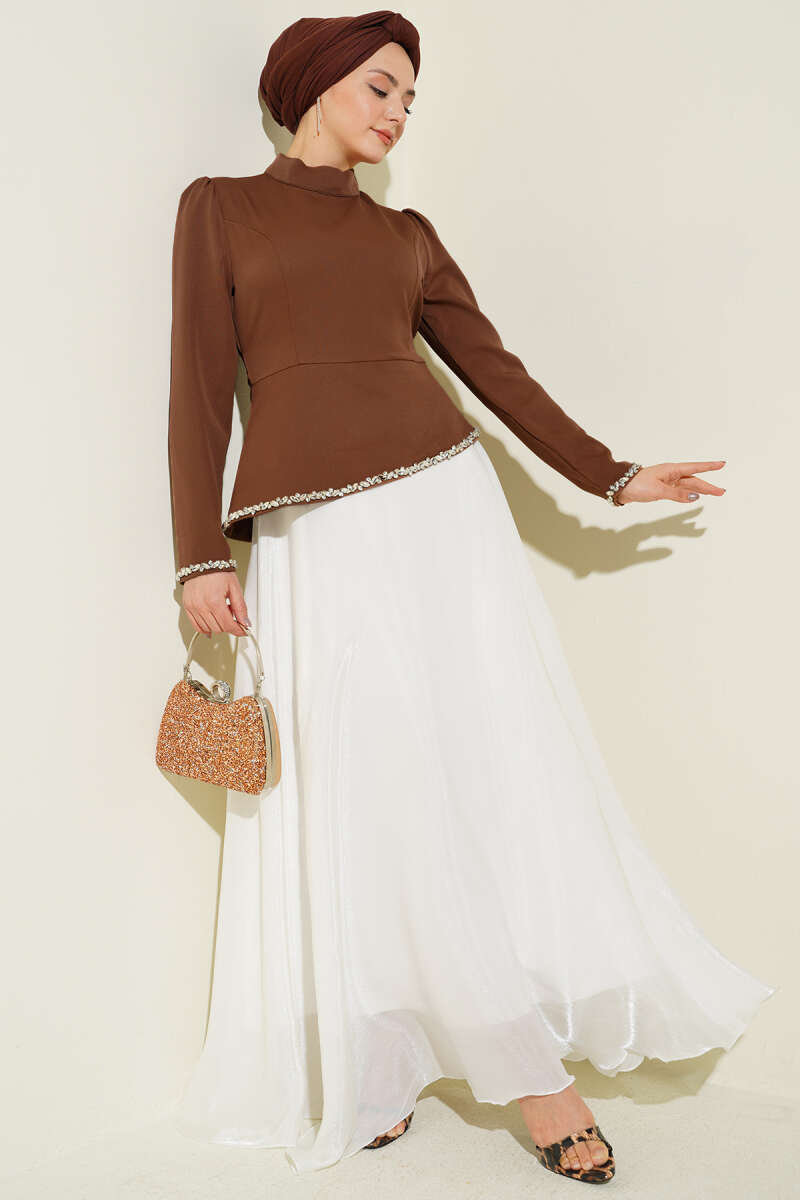 Taş Süslemeli Garnili Abiye Elbise Kahve