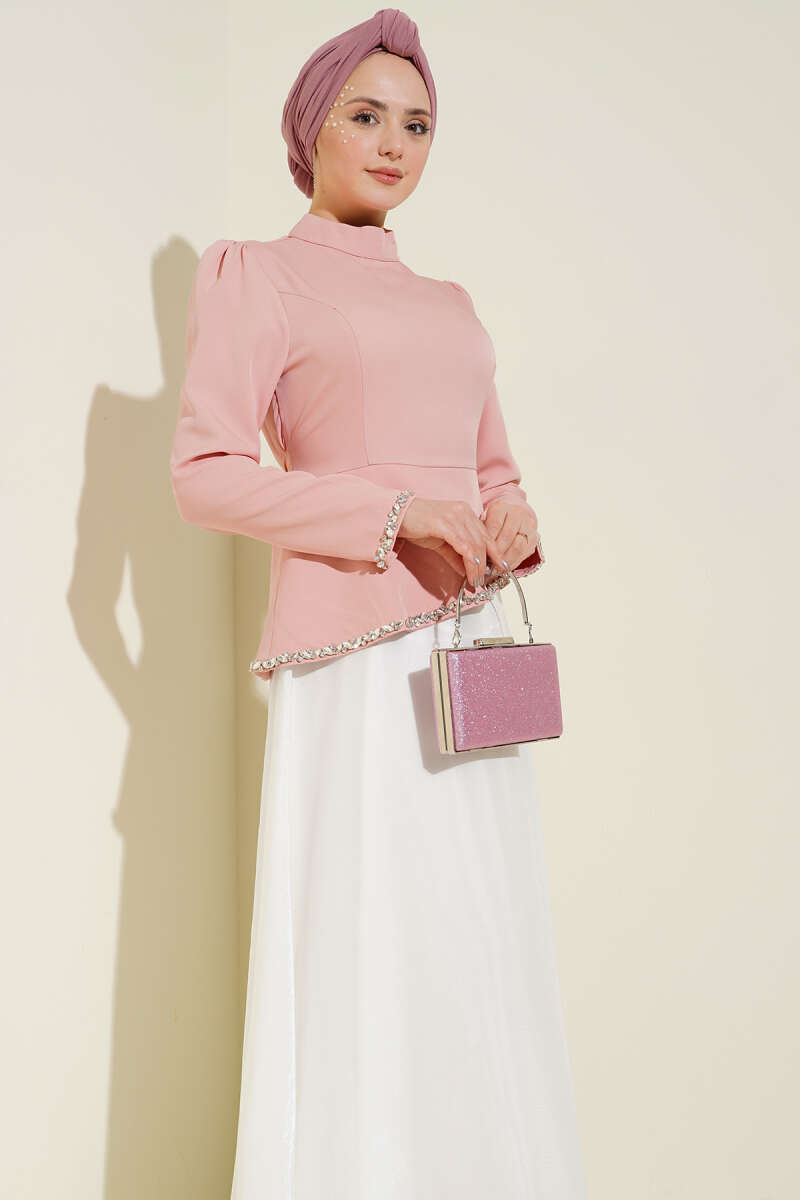 Taş Süslemeli Garnili Abiye Elbise Pudra