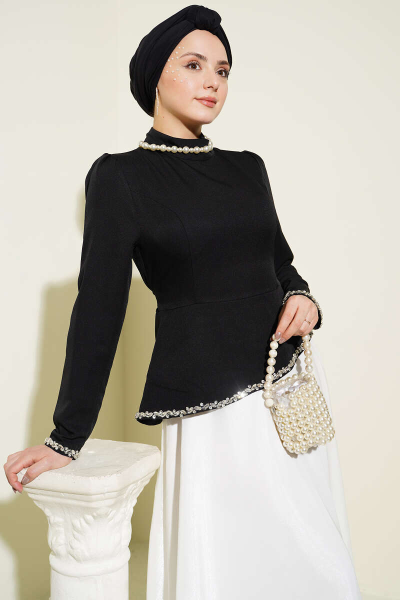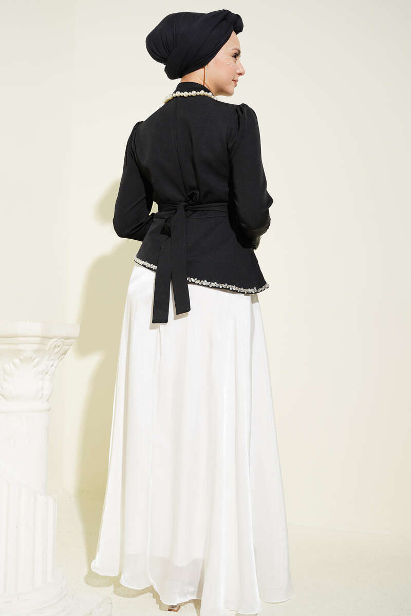 Taş Süslemeli Garnili Abiye Elbise Siyah