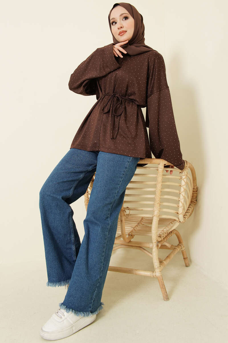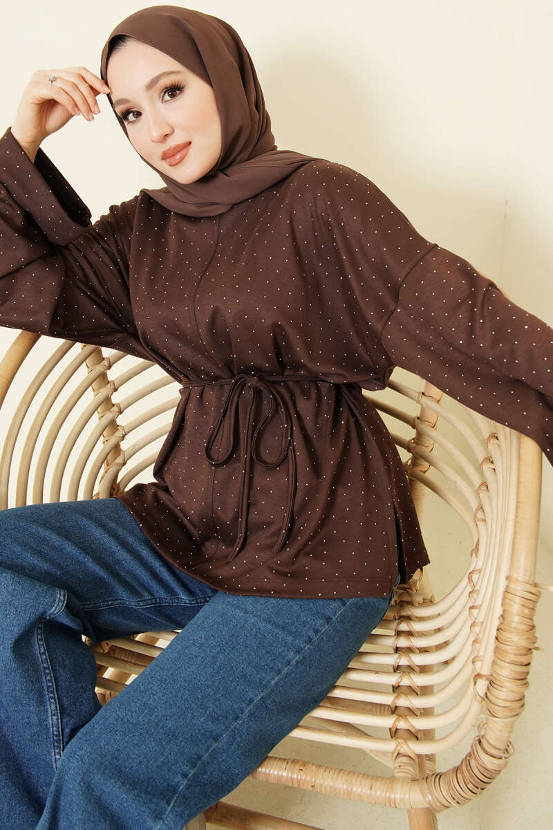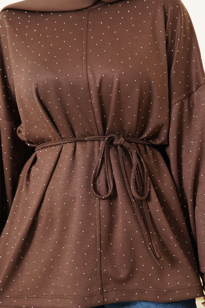 Taş Süslemeli İp Kuşaklı Tunik Kahve