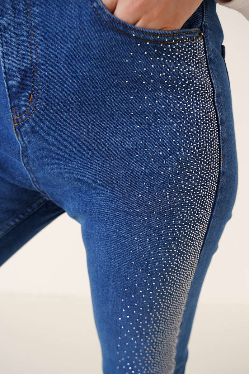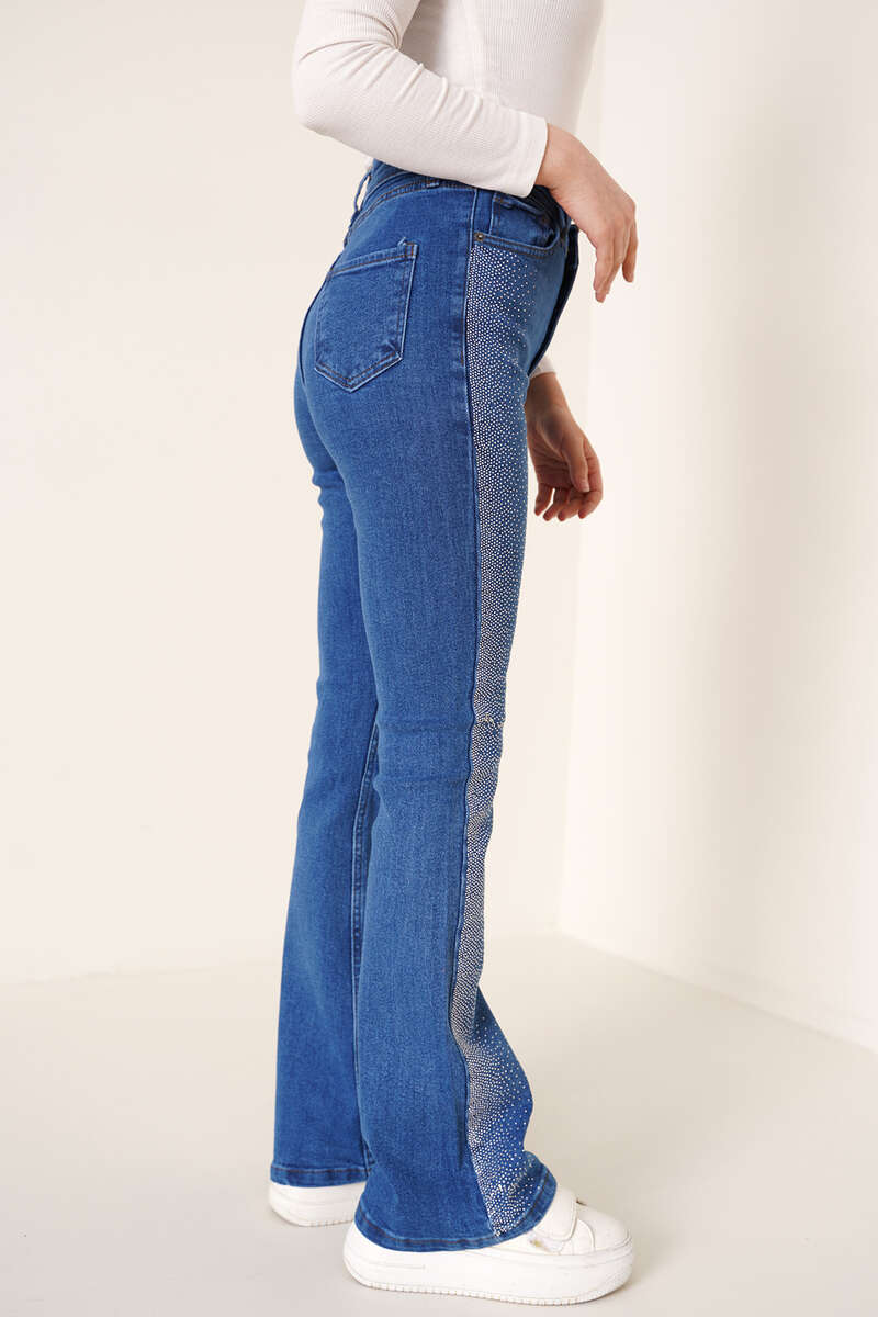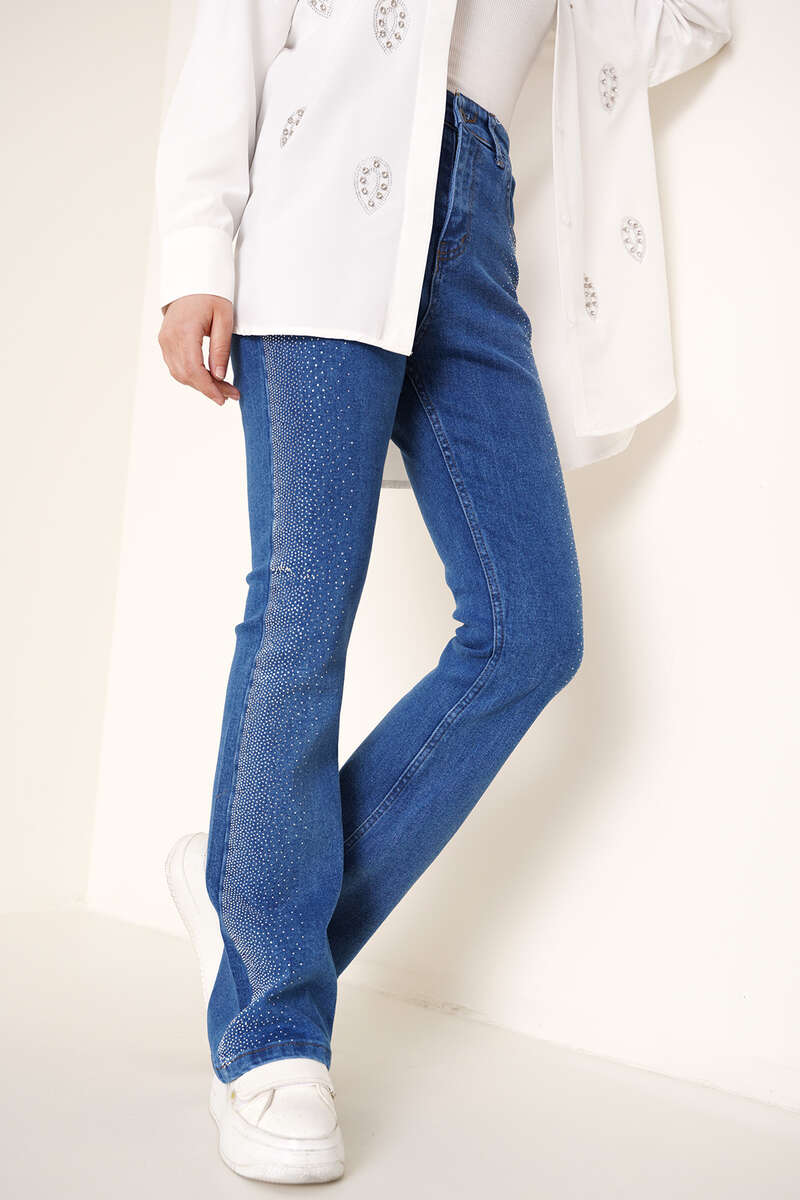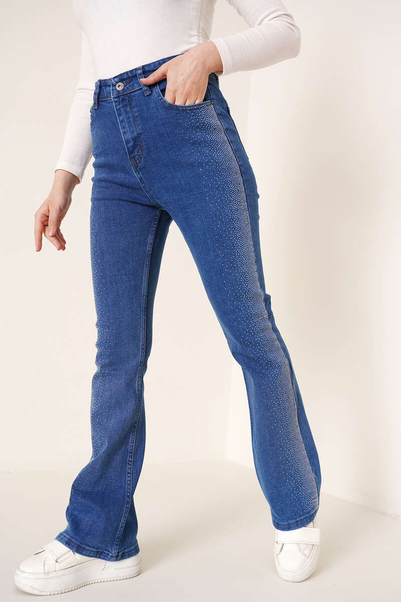 Taş Süslemeli İspanyol Paça Jean Pantolon Orta Mavi