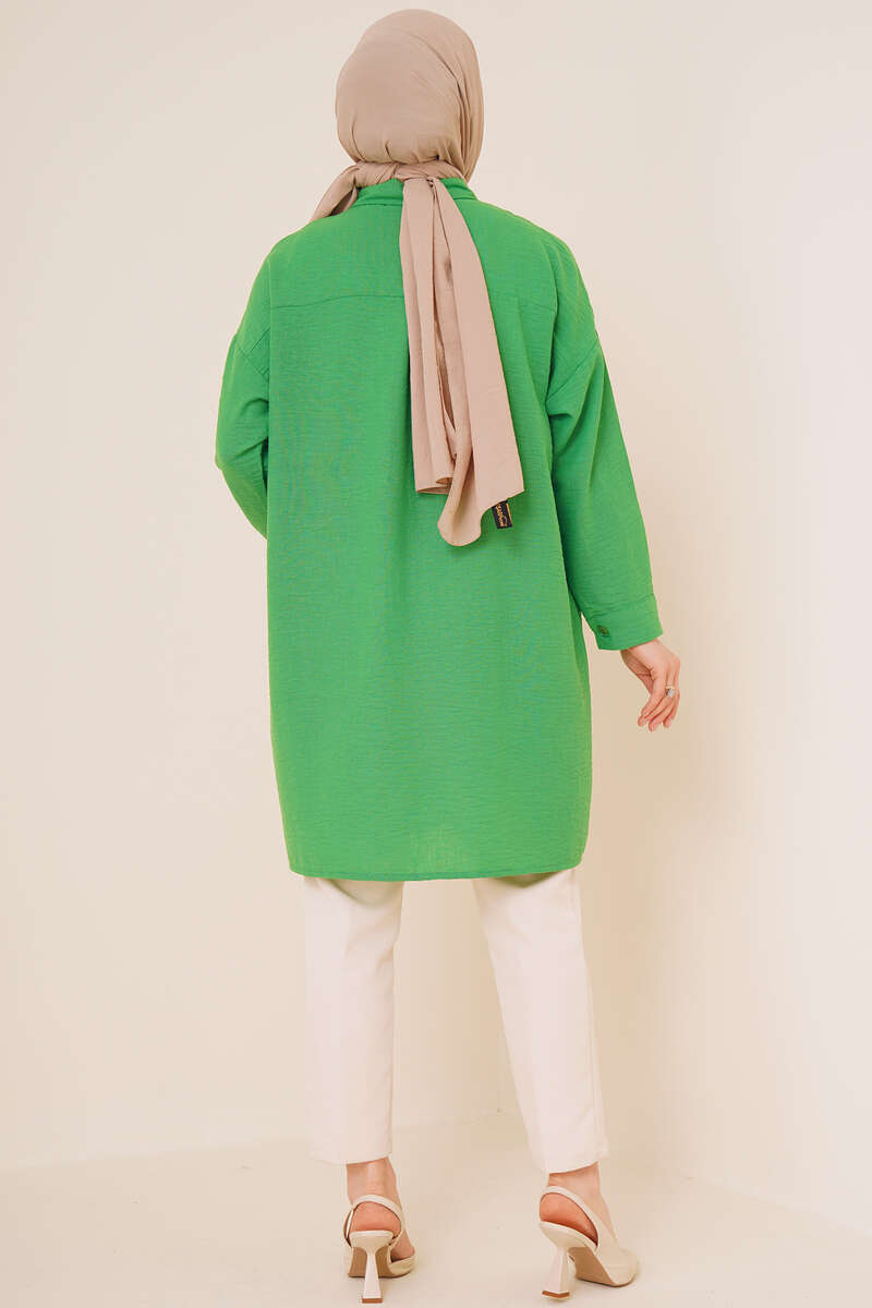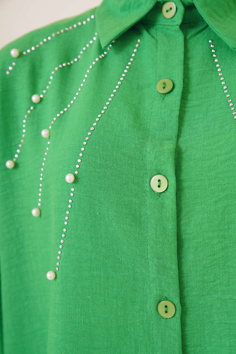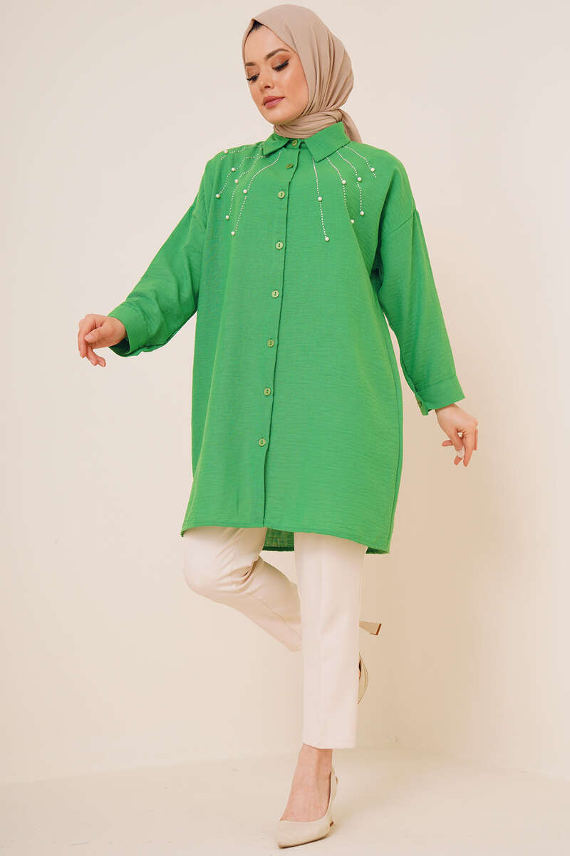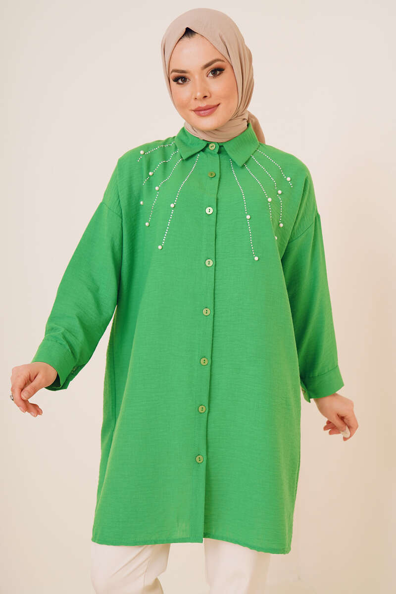 Yeni sezon gömleğimiz ışıltılı görünümüyle sizler için geldi. Gömleğimiz taş süslemelidir. Uzundur. Keten kumaştan yapılmıştır. Her ortamda rahatlıkla kombin yapabilirsiniz. Farklı renk seçenekleri mevcuttur.
