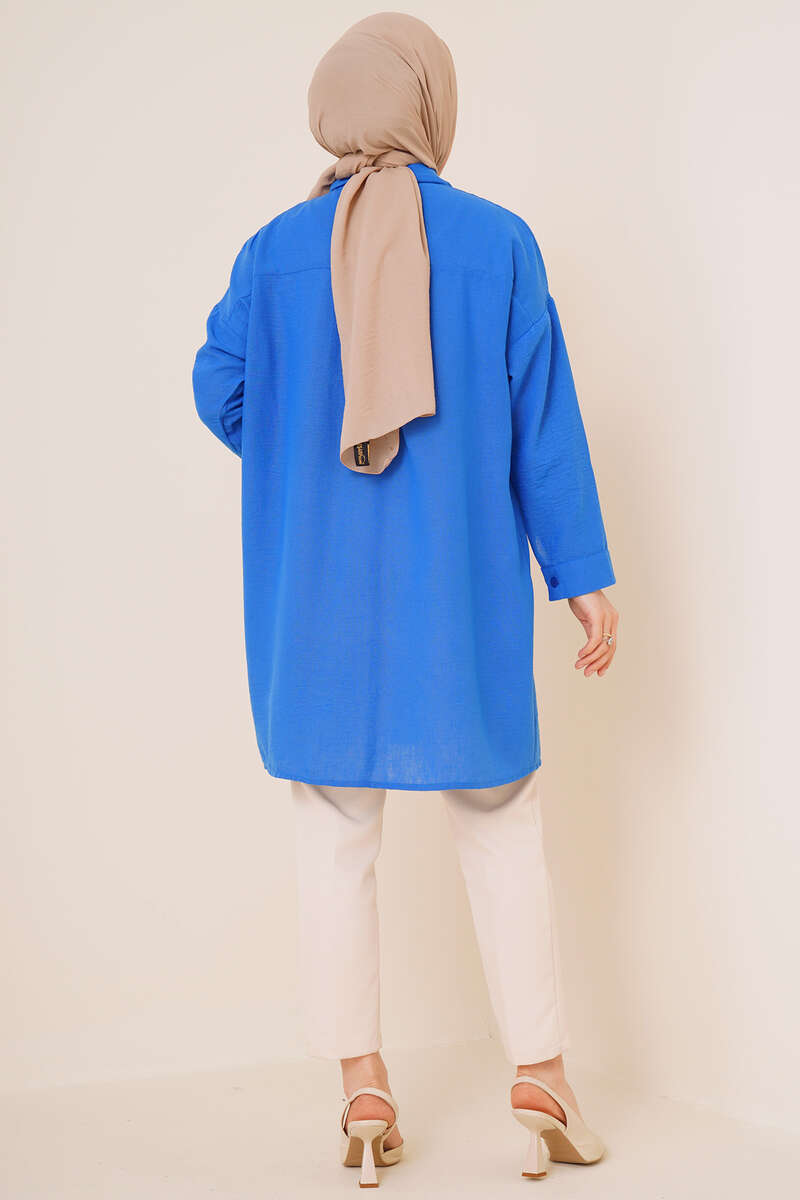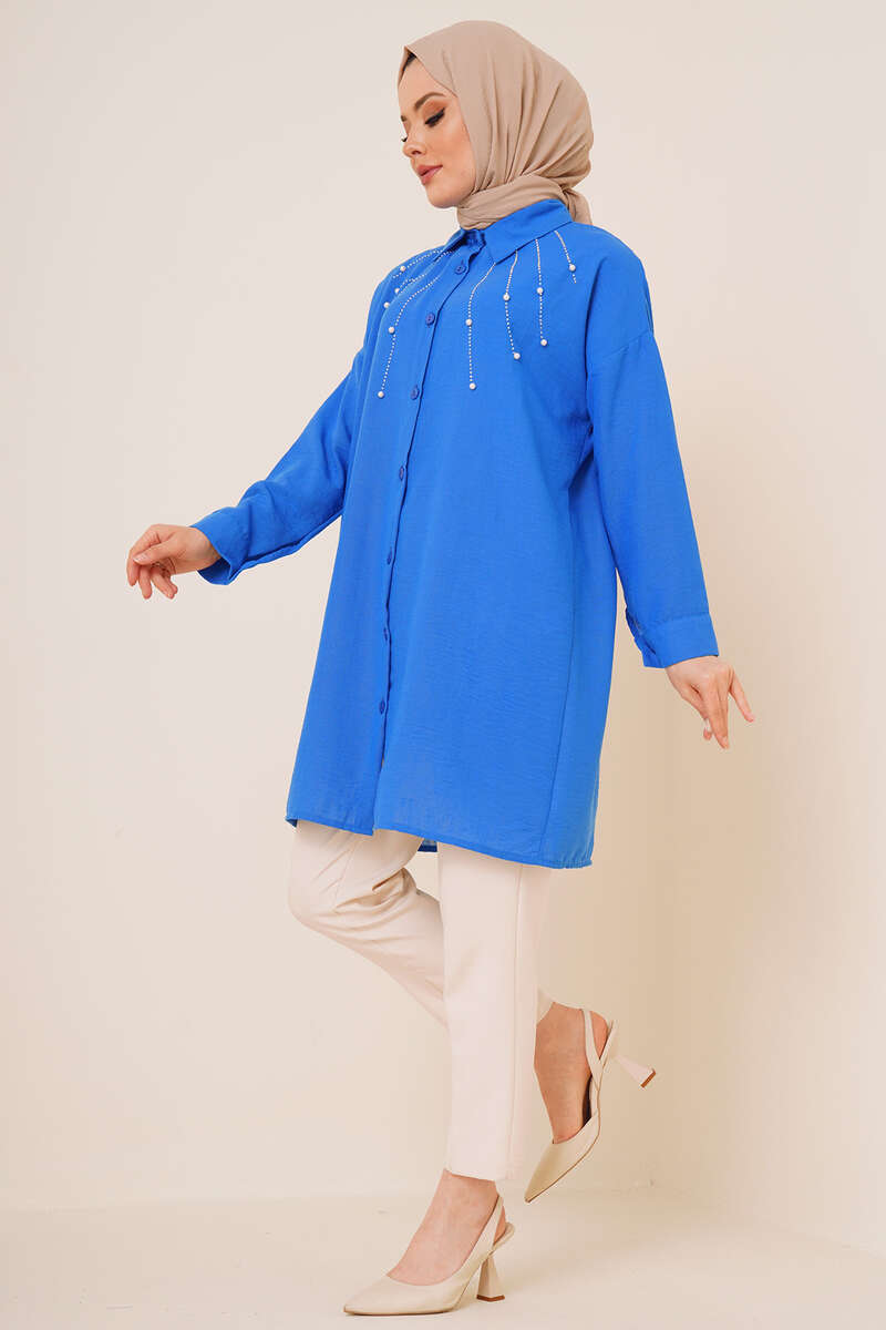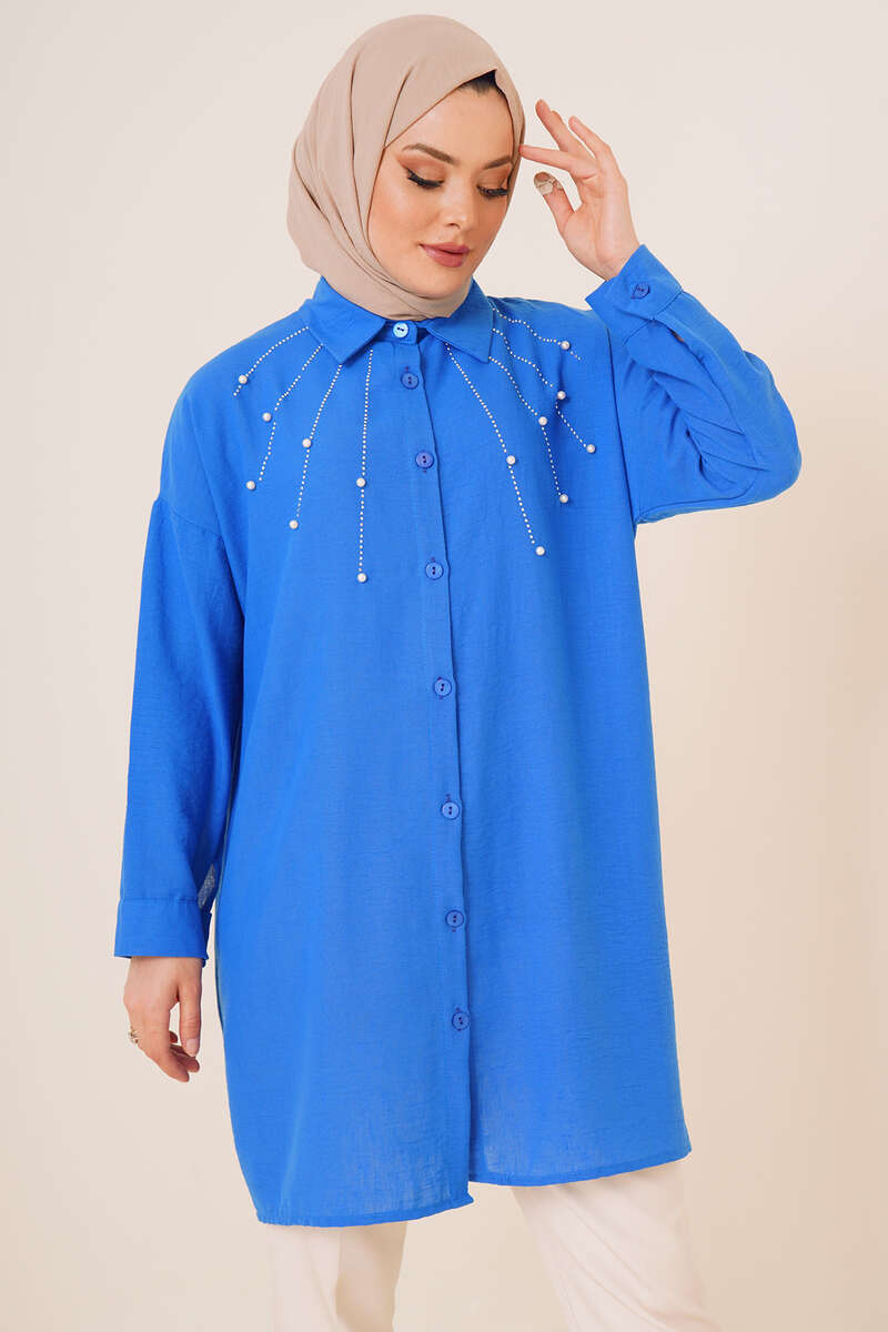 Yeni sezon gömleğimiz ışıltılı görünümüyle sizler için geldi. Gömleğimiz taş süslemelidir. Uzundur. Keten kumaştan yapılmıştır. Her ortamda rahatlıkla kombin yapabilirsiniz. Farklı renk seçenekleri mevcuttur.