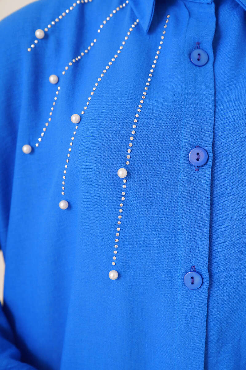 Taş Süslemeli Keten Gömlek Saks