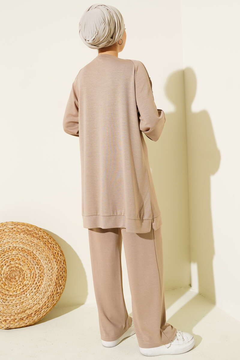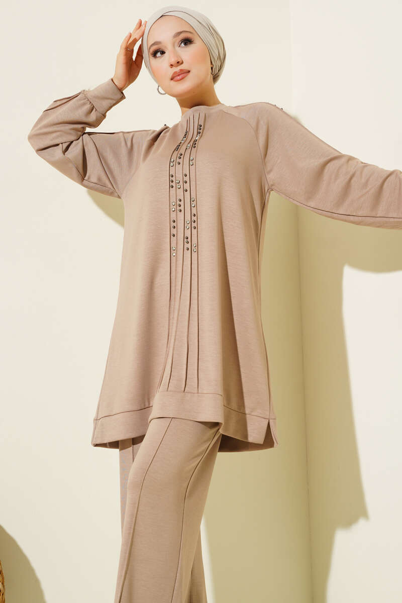 Önü Pileli Kemerli Scuba İkili Takım Kahve