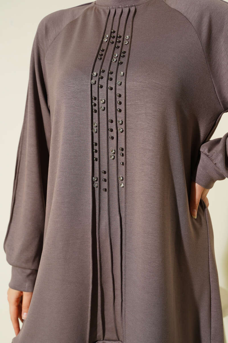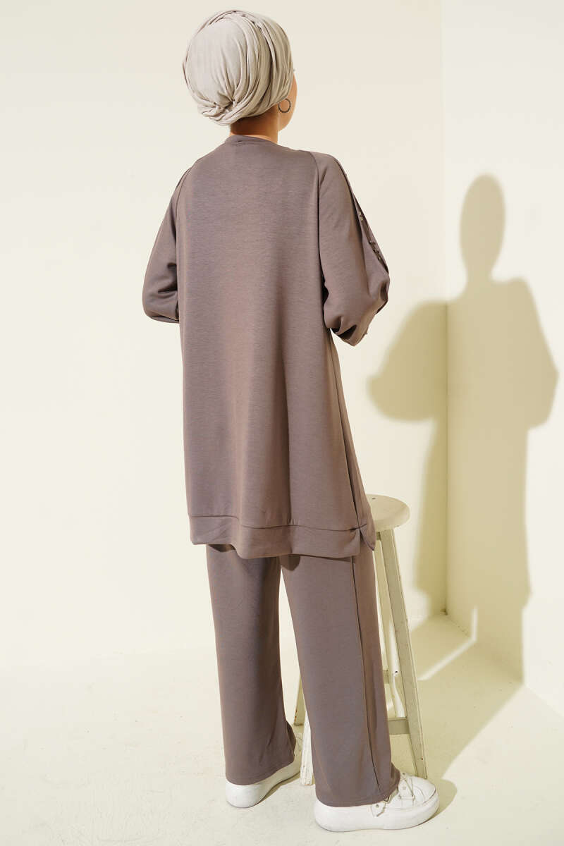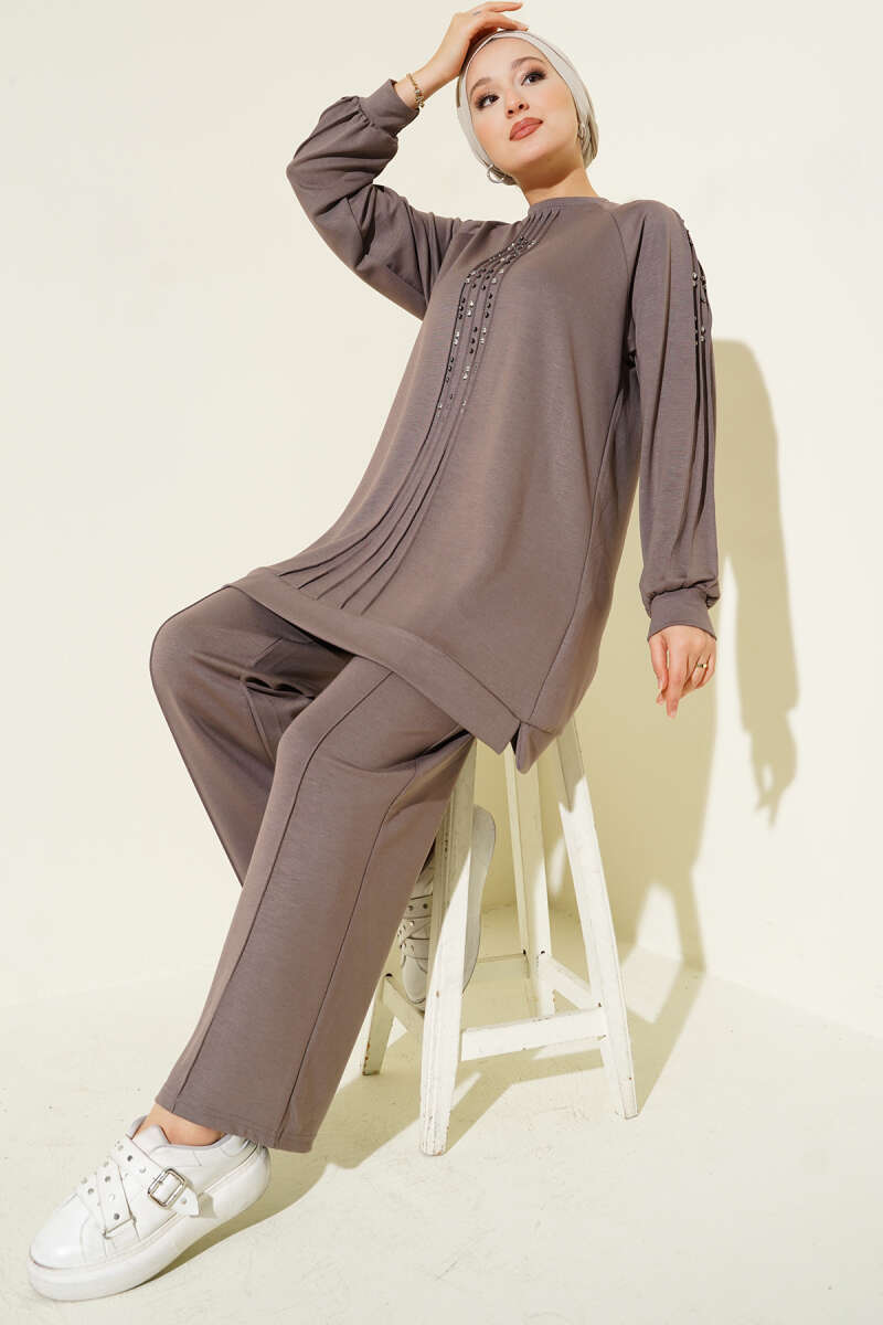 Önü Pileli Kemerli Scuba İkili Takım Kahve