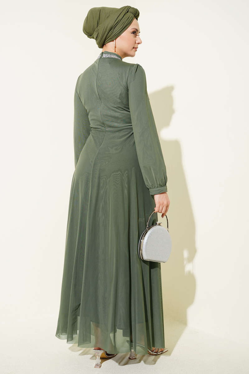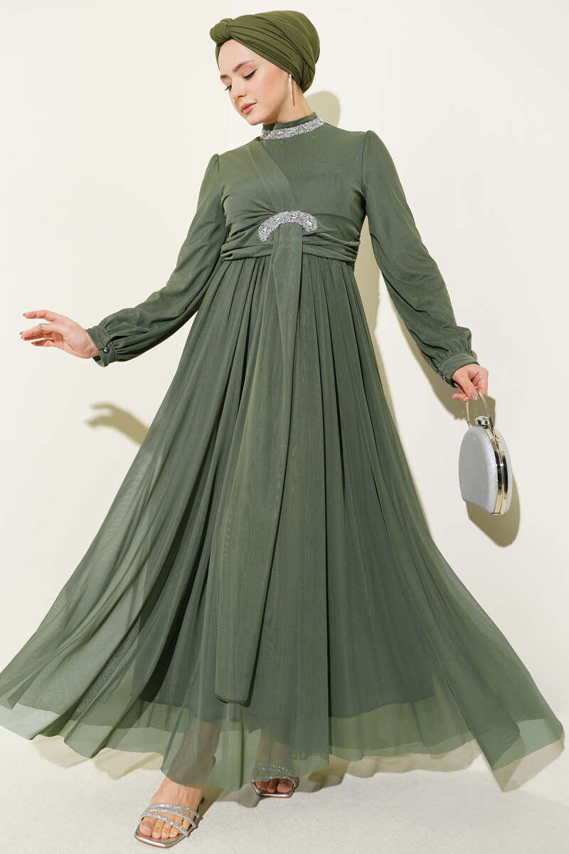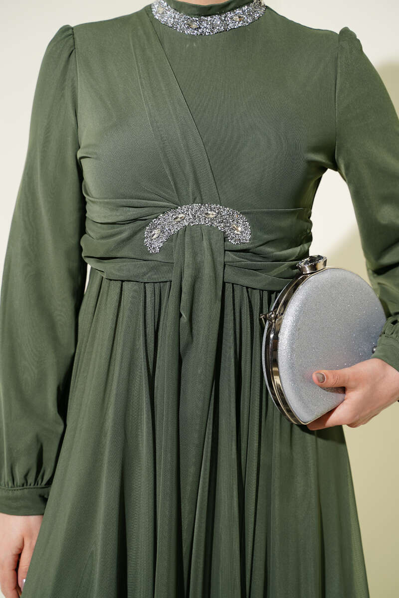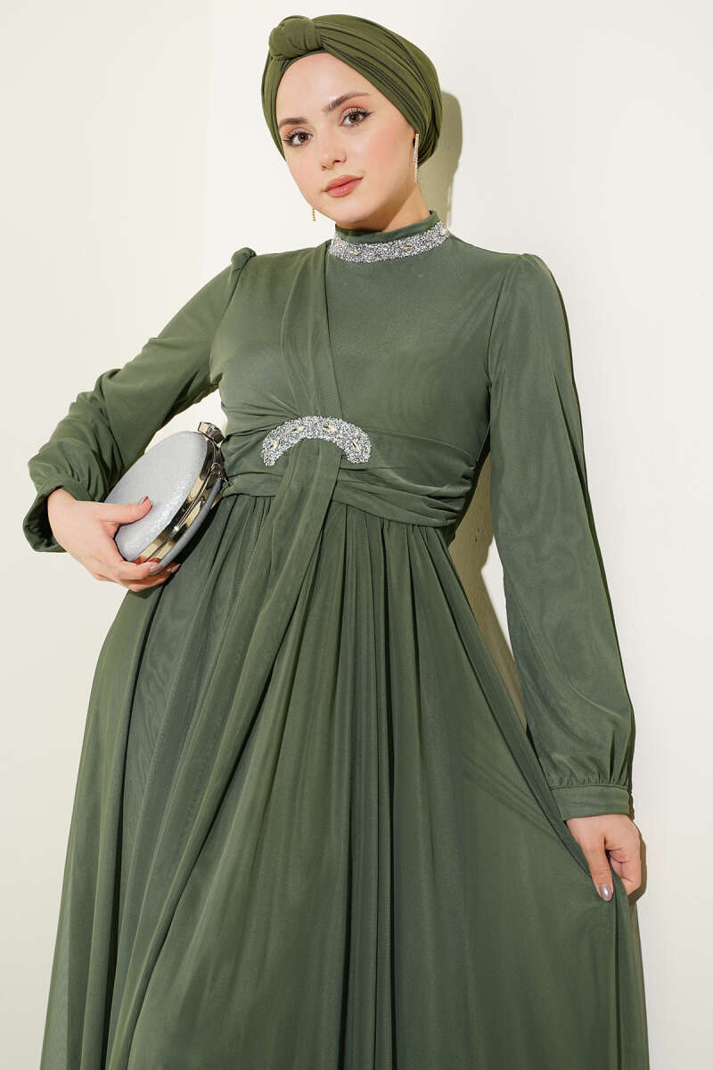 Taş Süslemeli Manşet Düğmeli Abiye Elbise Haki