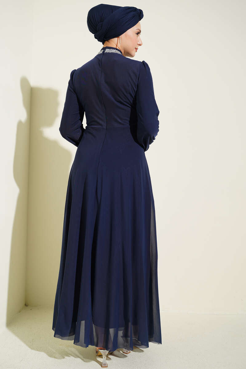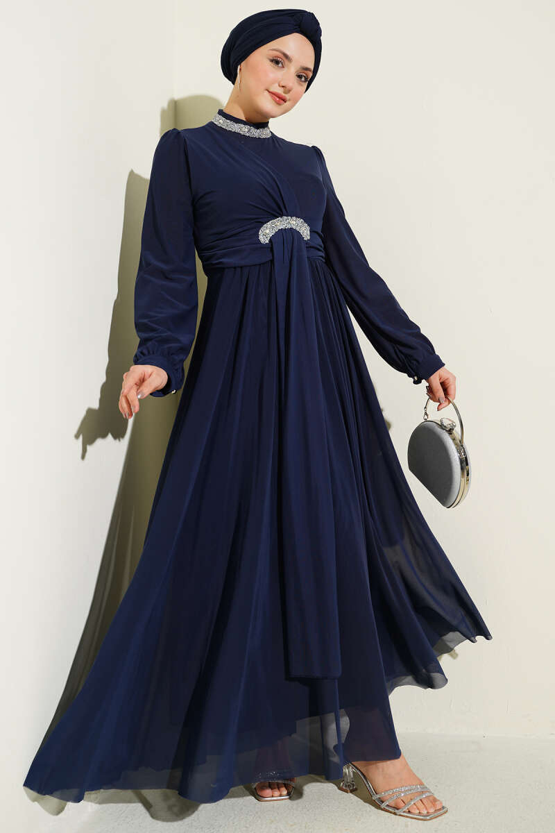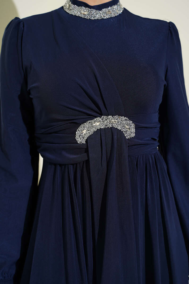Taş Süslemeli Manşet Düğmeli Abiye Elbise Lacivert