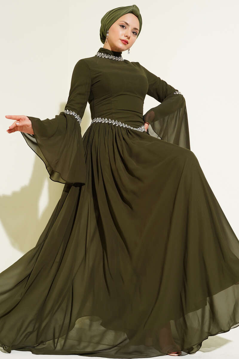 Bel Taşlı Pelerinli Abiye Elbise Haki