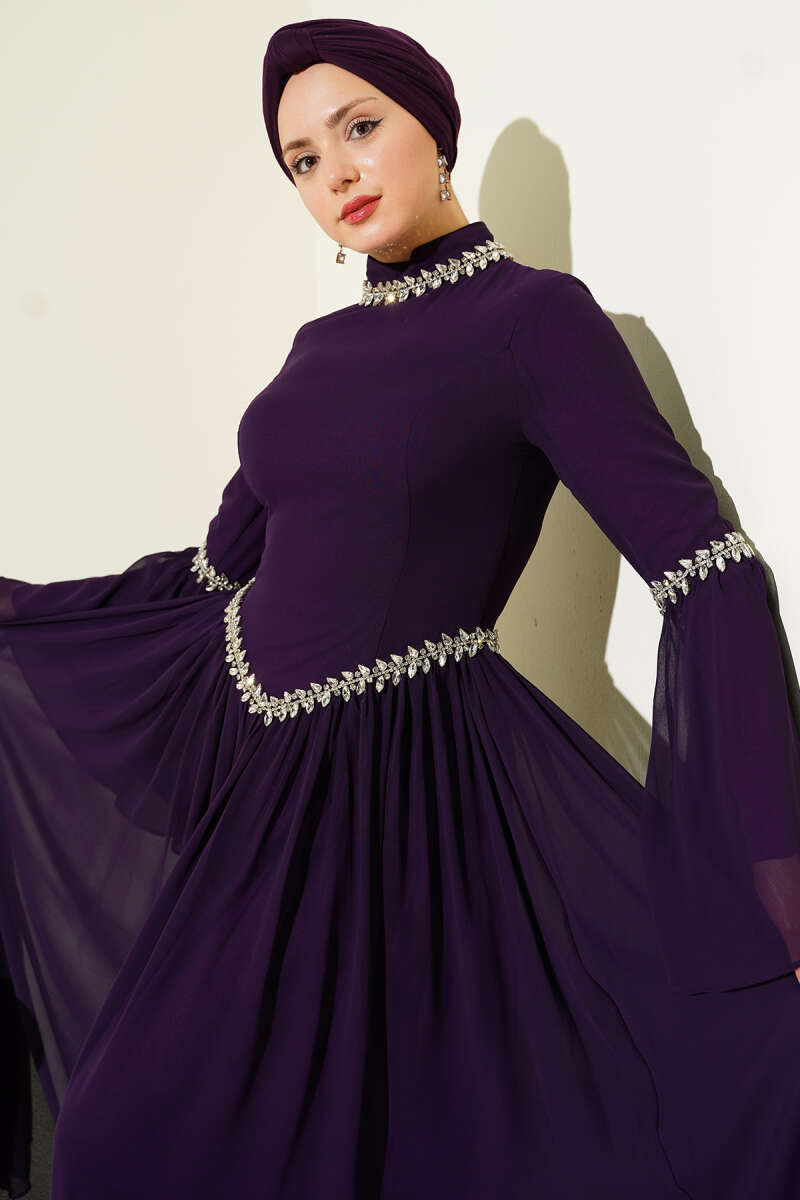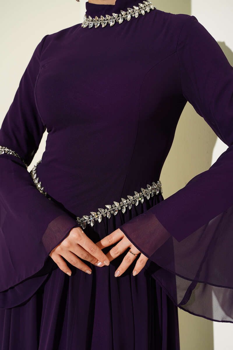 Bel Taşlı Pelerinli Abiye Elbise Kahve