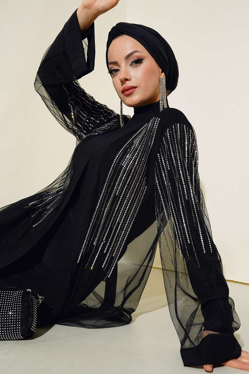 Yeni sezon abayamız şık tarzıyla sizlerle beraber. Abayamız iki parçadan oluşmaktadır. Abayamız sade olup, uzun tül hırkası taşlarla süslüdür. Kol bilekleri ribanalıdır. Kendi kumaşından kuşağı vardır. Abayamız şık ve zarif görüntüsüyle özel günlerinizin favorisi olacak.