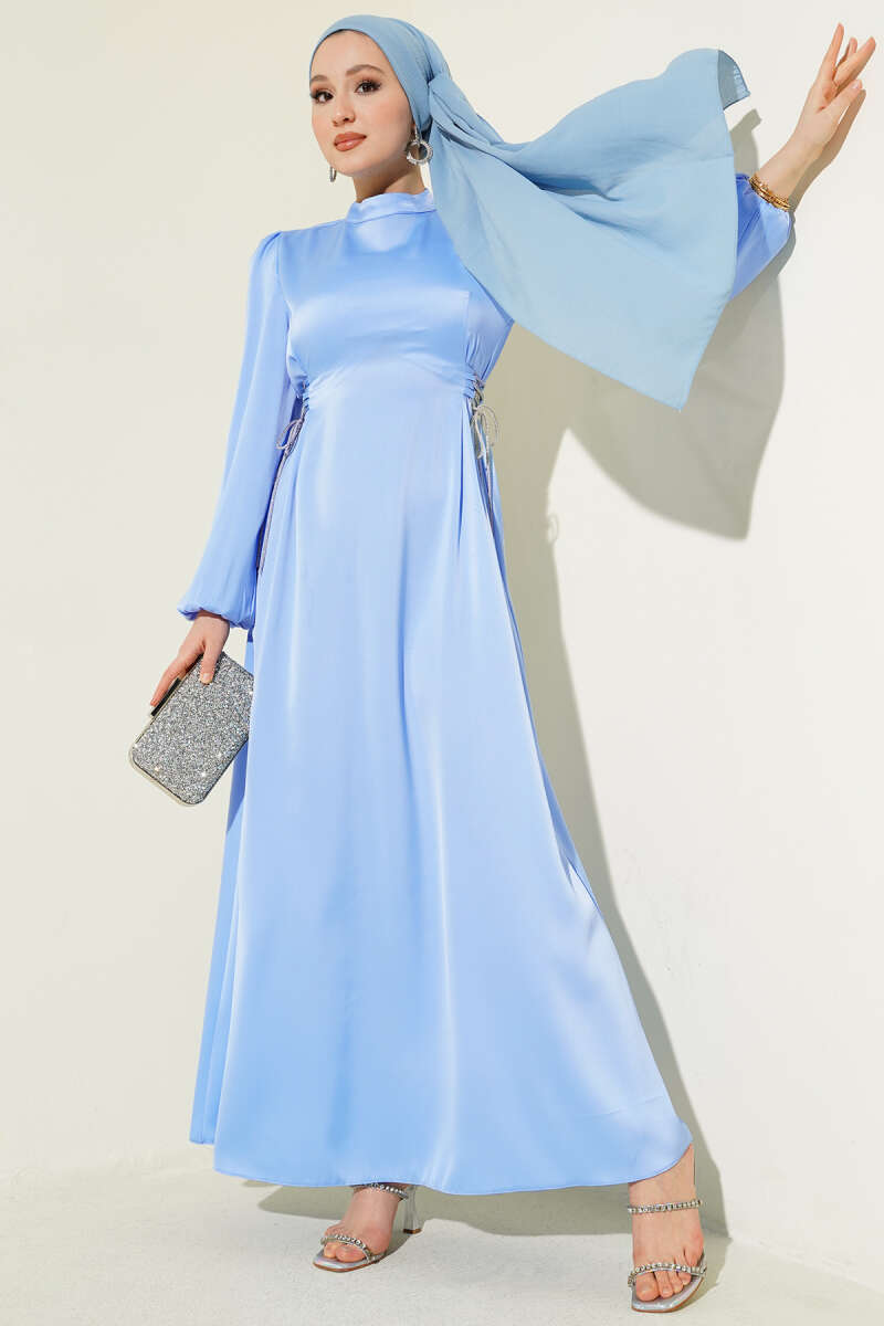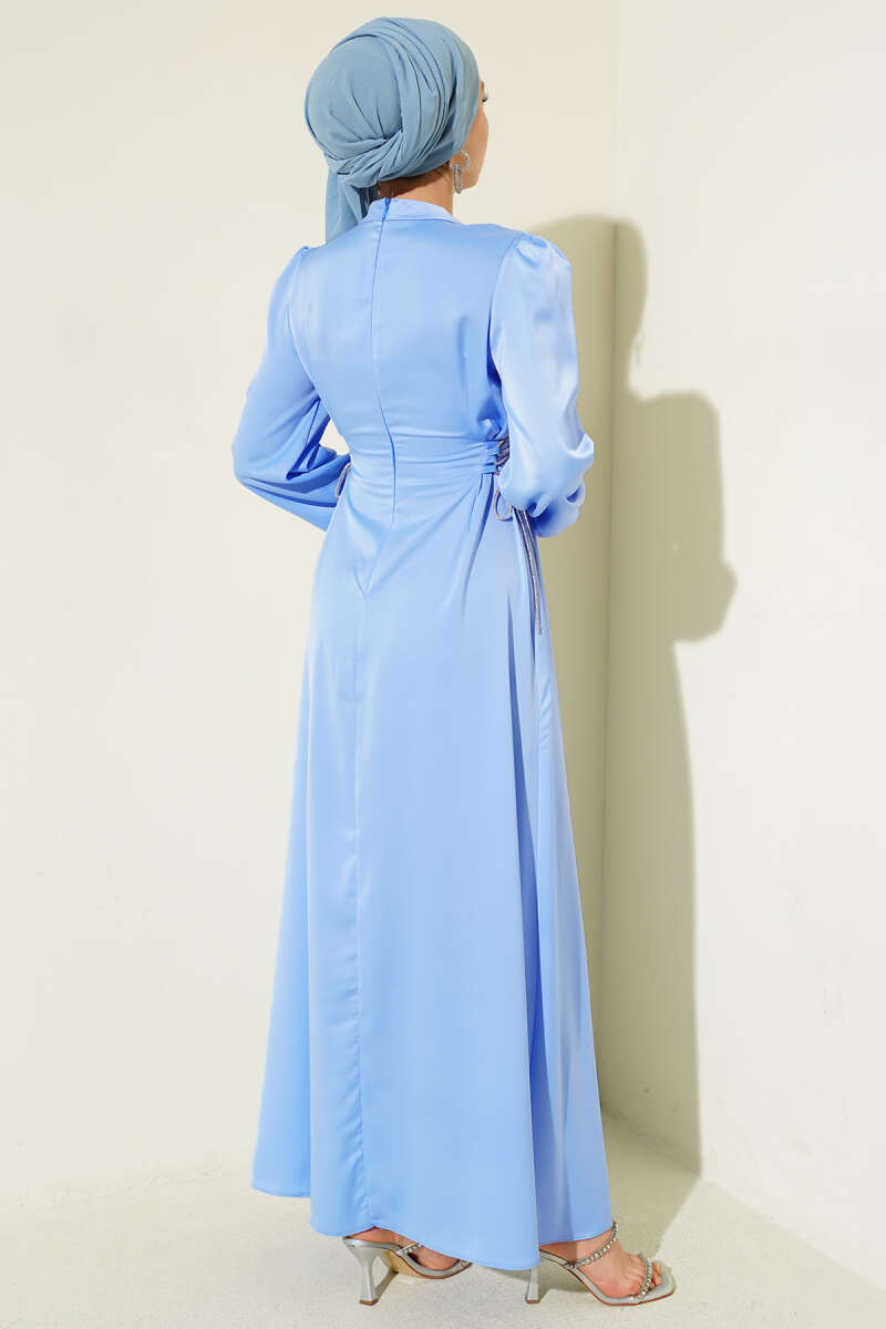 Taşlı Bağlamalı Saten Abiye Elbise Bebe Mavi