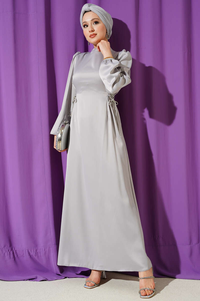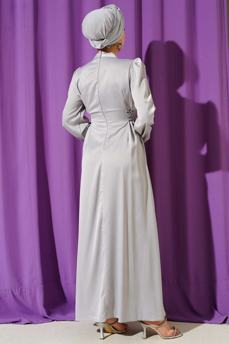 Taşlı Bağlamalı Saten Abiye Elbise Gri